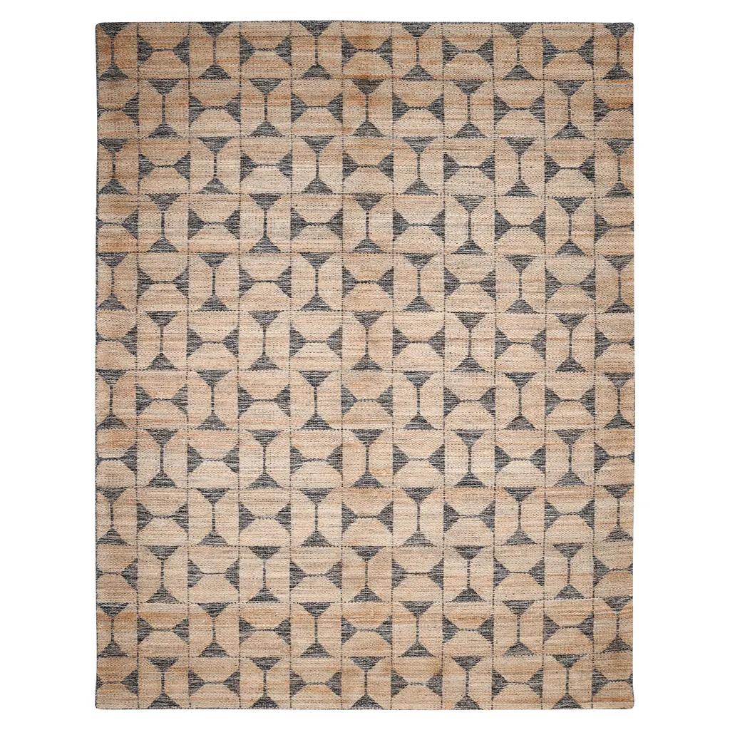 This Contemporary Jute Blend Rug offers a durable and stylish flooring solution for various living spaces. Measuring 2'6" x 8', this runner is designed for placement in hallways, entryways, or to define zones within larger rooms. The rug is constructed from a blend of natural fibers, featuring 60% jute and 40% cotton. Jute provides durability and a distinct natural texture, while cotton adds softness and structural integrity. The flatweave construction contributes to the rug's strength and allows for a low profile, suitable for areas with frequent foot traffic. The design showcases a distinct geometric pattern. A natural brown hue, characteristic of jute, forms the base color. This is complemented by a repeating dark contrasting pattern of stylized hourglass or bowtie shapes arranged within a grid. This graphic motif provides visual interest and a modern aesthetic. Handcrafted in India, this rug combines traditional techniques with a contemporary design sensibility. It is suitable for modern, casual, or transitional interiors, adding both texture and pattern without overwhelming a space. The natural fiber composition makes it a practical choice for everyday use.