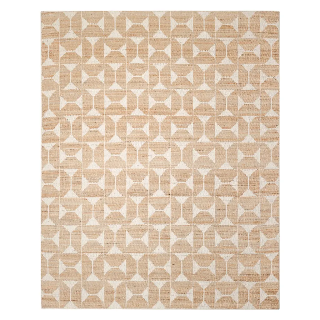 This Contemporary Jute Blend Rug offers a durable and stylish flooring solution for various living spaces. Measuring 2'6" x 8', this runner is designed for placement in hallways, entryways, or to define zones within larger rooms. The rug is constructed from a blend of natural fibers, featuring 60% jute and 40% cotton. Jute provides durability and a distinct natural texture, while cotton adds softness and structural integrity. The flatweave construction contributes to the rug's strength and allows for a low profile, suitable for areas with frequent foot traffic. The design showcases a distinct geometric pattern. A natural brown hue, characteristic of jute, forms the base color. This is complemented by a repeating dark contrasting pattern of stylized hourglass or bowtie shapes arranged within a grid. This graphic motif provides visual interest and a modern aesthetic. Handcrafted in India, this rug combines traditional techniques with a contemporary design sensibility. It is suitable for modern, casual, or transitional interiors, adding both texture and pattern without overwhelming a space. The natural fiber composition makes it a practical choice for everyday use.