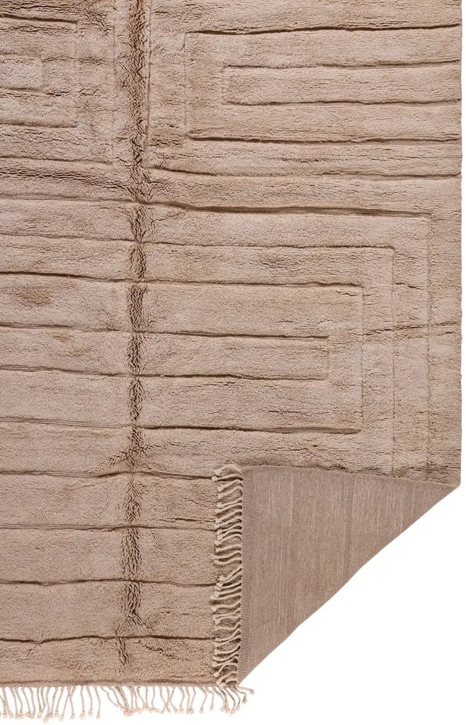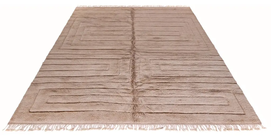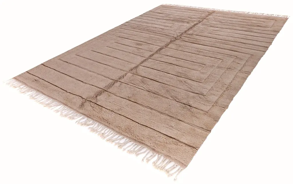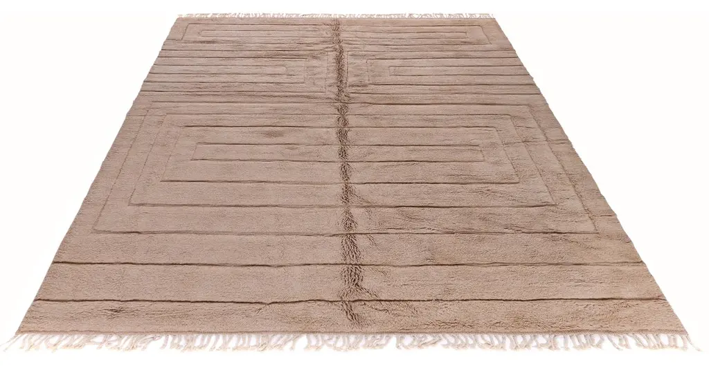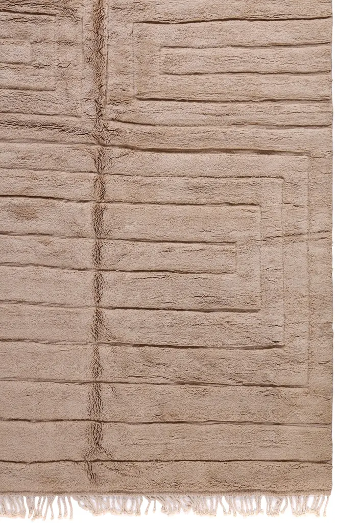 Elevate your space with this contemporary Moroccan rug, masterfully crafted in hand-knotted beige wool. The monochrome color palette is enriched by a sculptural linear relief pattern that adds quiet drama through subtle texture and geometric flow.Inspired by architectural precision and minimalist design principles, this plush rug merges traditional Berber craftsmanship with modern elegance. Its thick, luxurious pile and balanced linear motif make it a stunning centerpiece in both neutral and design-forward interiors.Perfect for living rooms, bedrooms, or curated gallery spaces, this one-of-a-kind rug offers a refined foundation with warmth, depth, and timeless artistry.Size: 9' x 12'