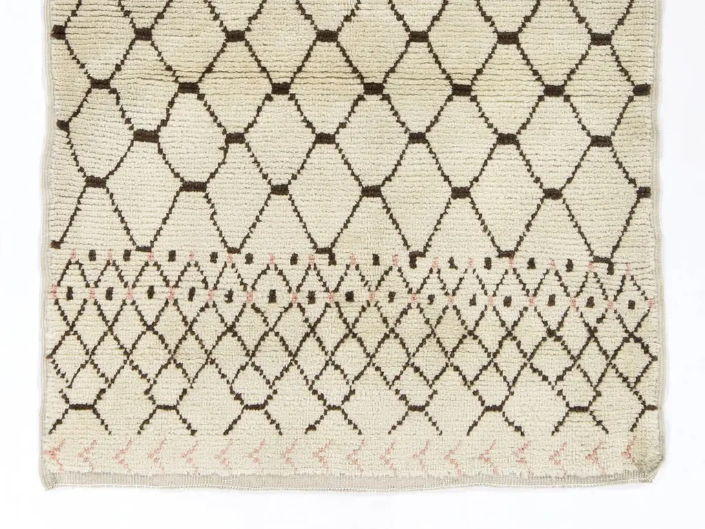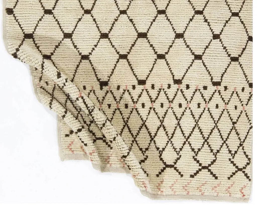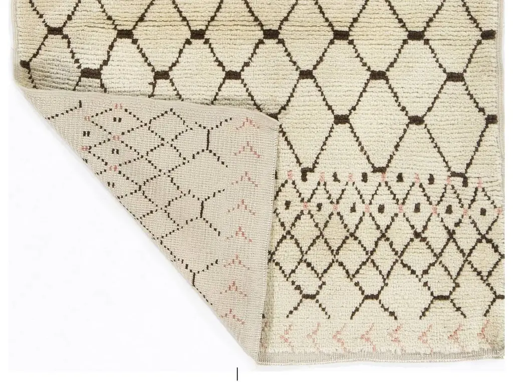 This contemporary hand-knotted rug was made by our skilled weaving team in Turkey, inspired by the timeless elegance of Moroccan tribal designs. The rug features a warm ivory ground enlivened with a rhythmic lattice of dark brown diamond motifs, accented subtly with pale rose details. Its balanced geometry and soft contrast make it a versatile piece that blends artisanal tradition with modern simplicity.Crafted entirely from 100% wool — including both pile and foundation — the rug offers a plush yet durable texture underfoot. The medium pile height provides comfort without sacrificing practicality, making it suitable for everyday use in living rooms, bedrooms, or study areas. Designed for contemporary interiors yet rooted in nomadic aesthetics, it’s a piece that brings understated sophistication and warmth.Styling Notes:Perfect for Scandinavian, Japandi, bohemian, eclectic, or modern organic interiors. Its neutral tones and handmade character pair seamlessly with minimalist furniture, natural wood accents, and layered textiles, making it an ideal foundation piece for residential or boutique-style commercial spaces.Custom Options:Available for custom production in your preferred size, color palette, and design, with a lead time of approximately 4–6 weeks.