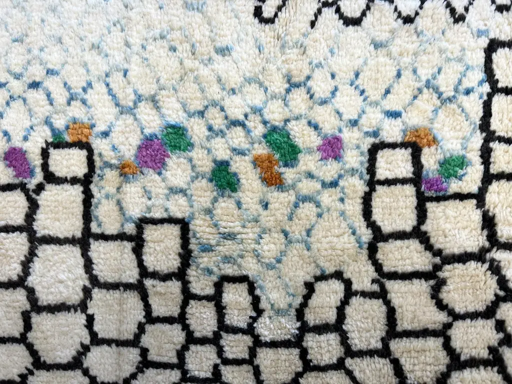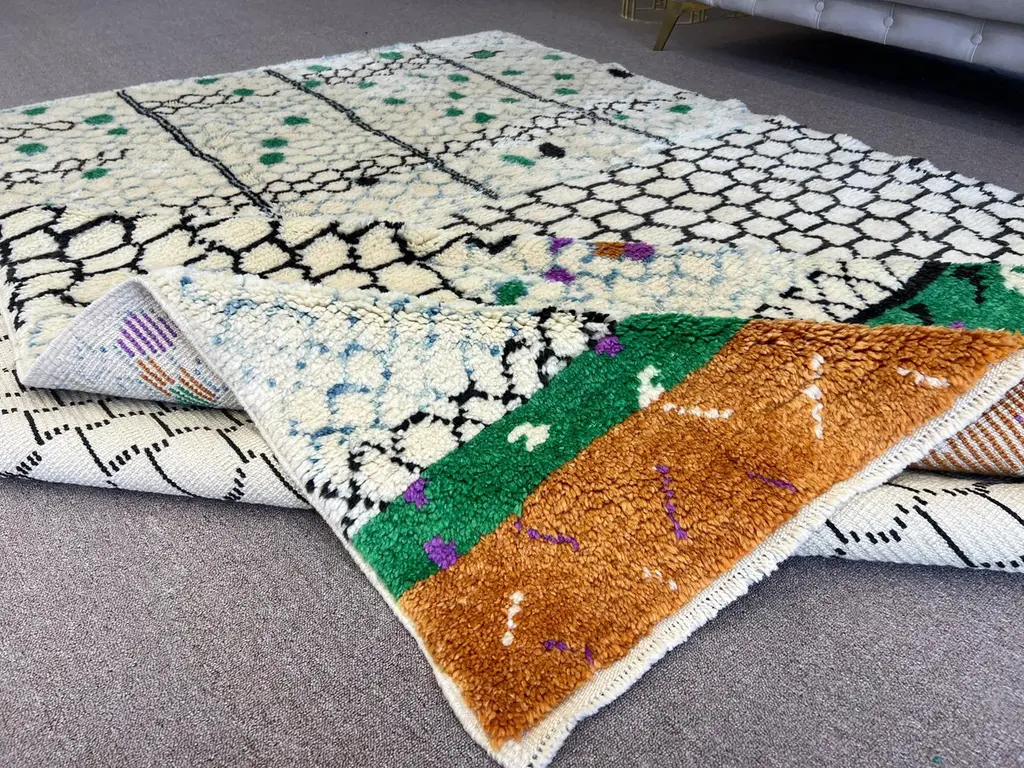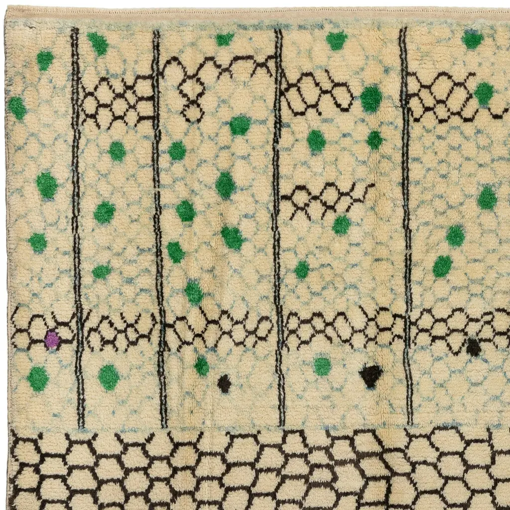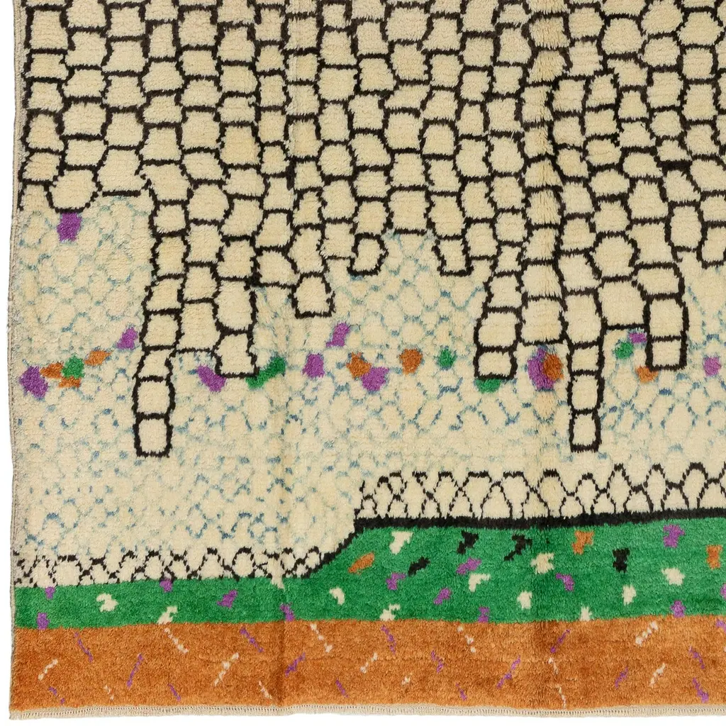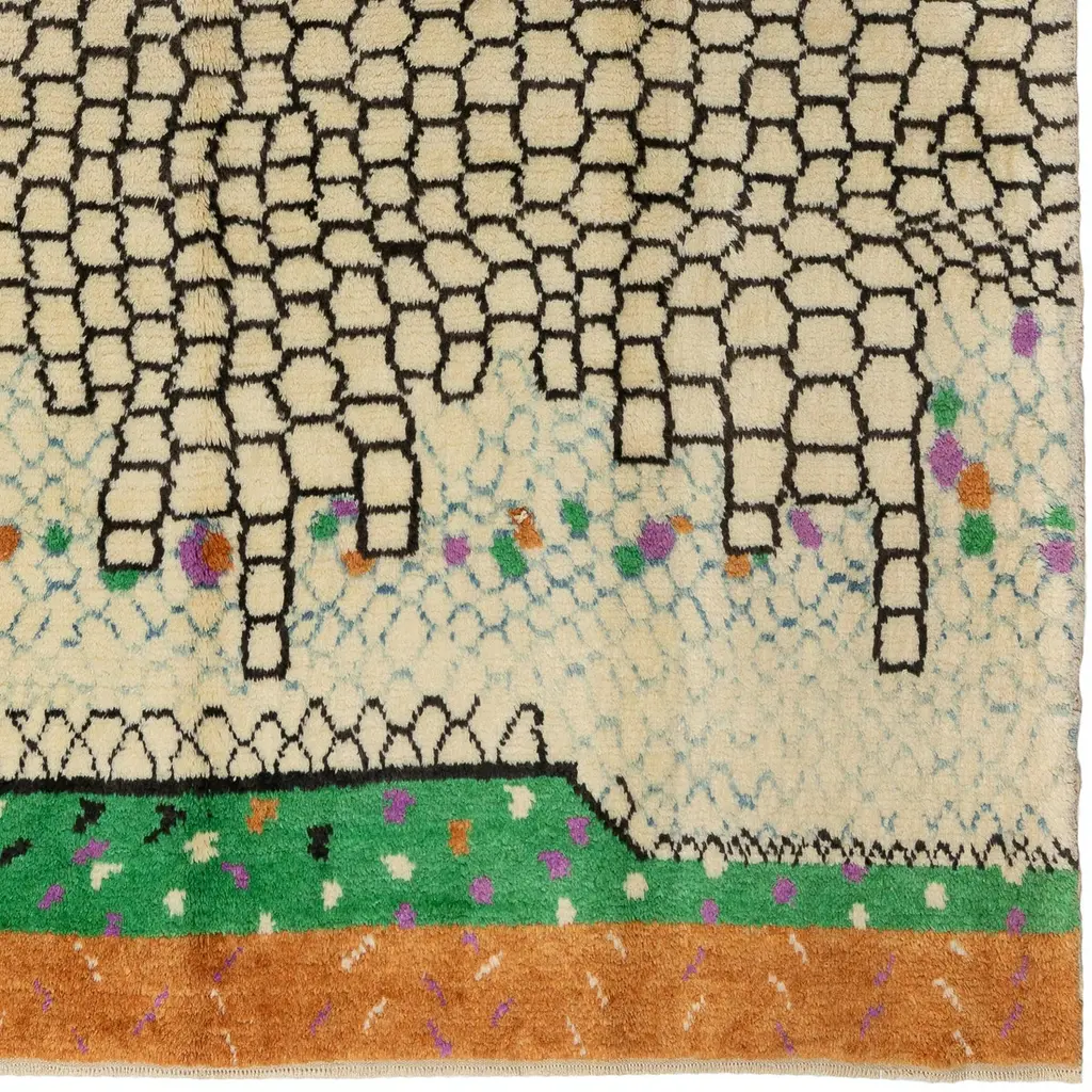 This contemporary hand-knotted wool rug, woven by master artisans in Turkey, takes inspiration from traditional Moroccan weaving while presenting a modern abstract design. The composition combines freeform geometric motifs with playful color accents in green, orange, purple, and black, layered over an ivory ground. Its bold yet organic pattern recalls mid-century Moroccan Beni Ourain and abstract art influences, making it equally suitable for contemporary interiors and eclectic spaces.Crafted from 100% wool with a dense, durable pile, the rug balances softness underfoot with long-lasting strength. Measuring 8 x 10 ft, it is a versatile size for living rooms, dining areas, and open-plan spaces.•Origin: Turkey (Moroccan-style weave)•Age: Contemporary, 21st century•Material: 100% hand-knotted wool•Design: Abstract Moroccan-inspired geometric composition•Condition: ExcellentCustom sizes, colors, and designs can also be produced upon request with a lead time of 4–6 weeks.