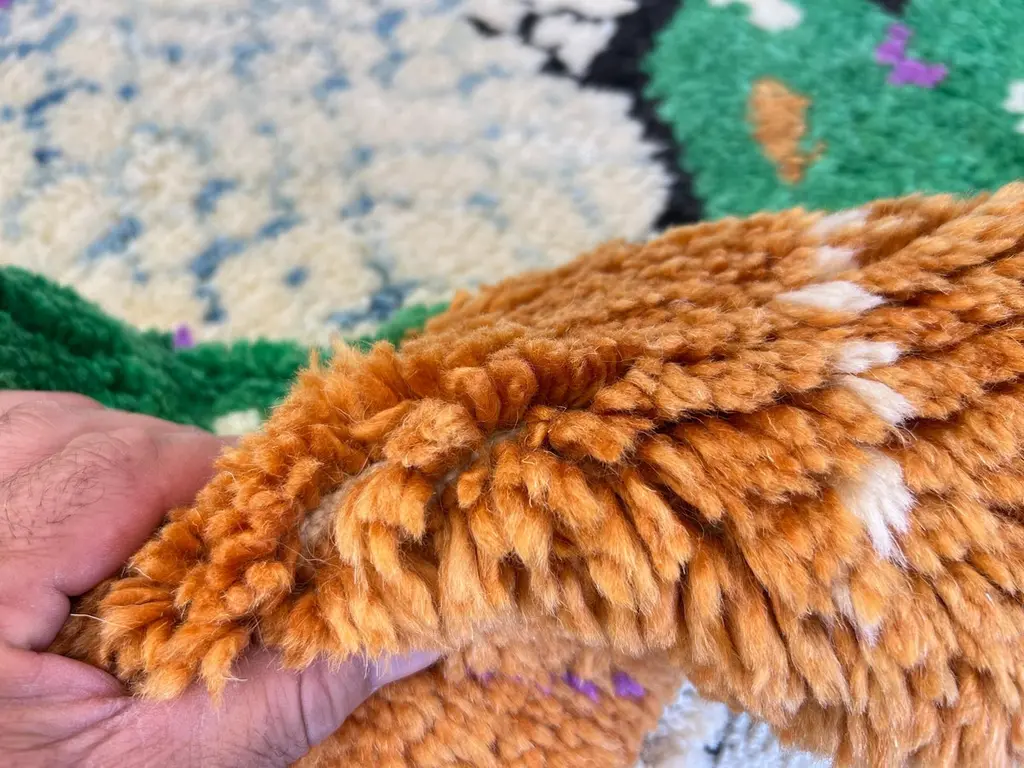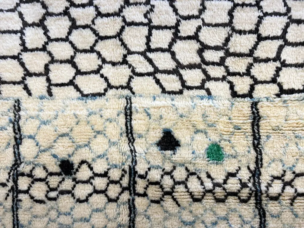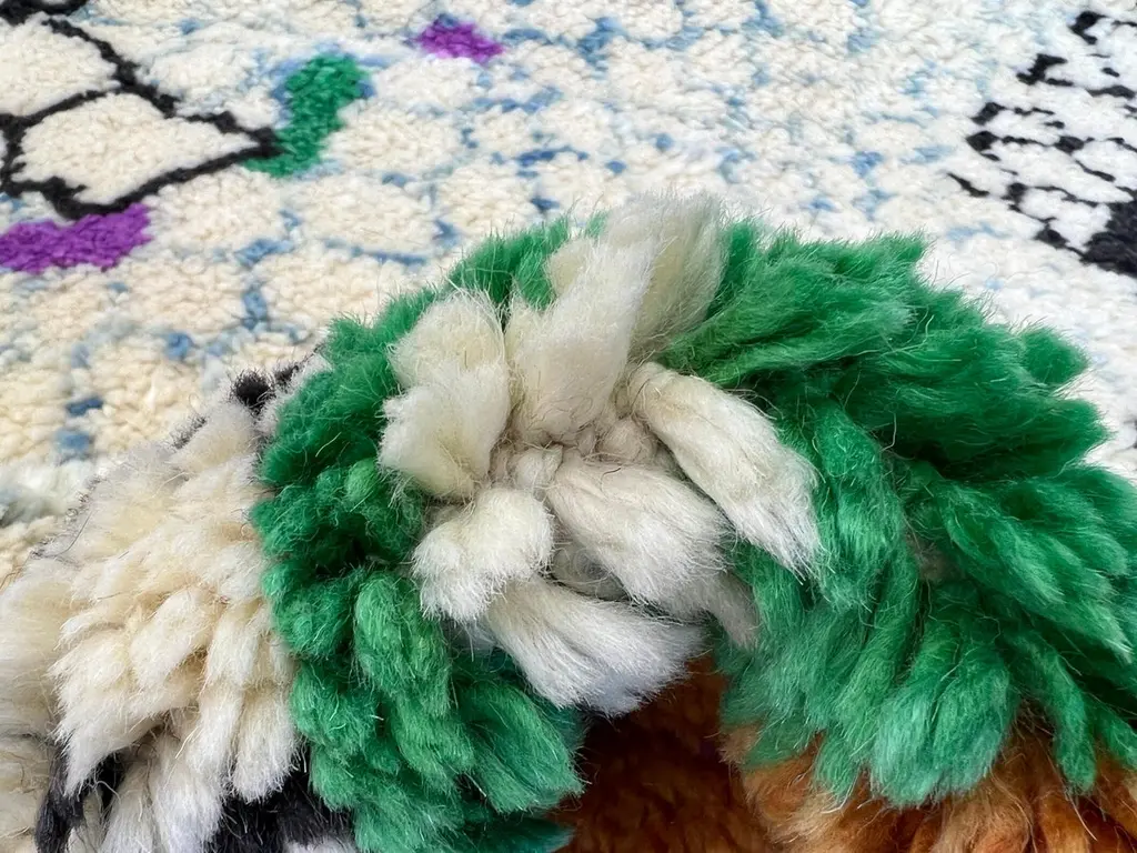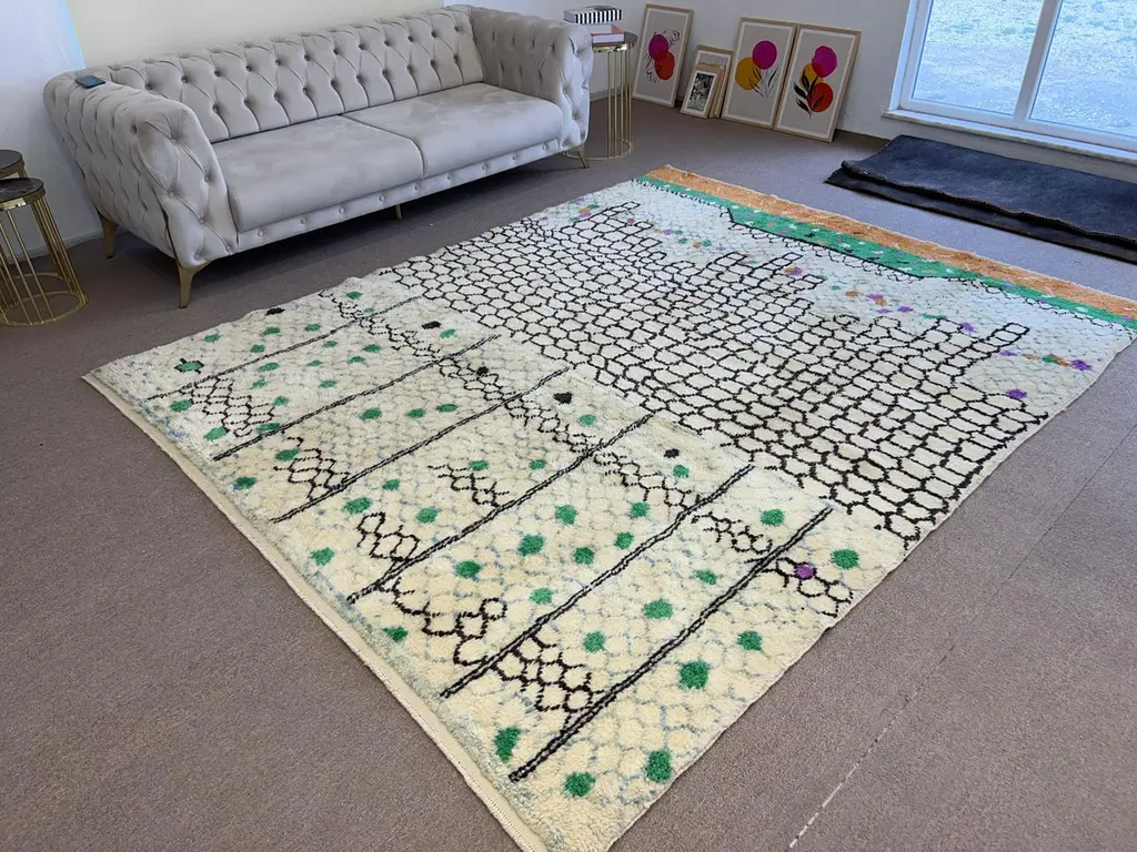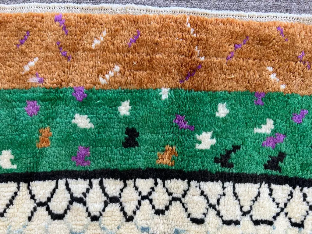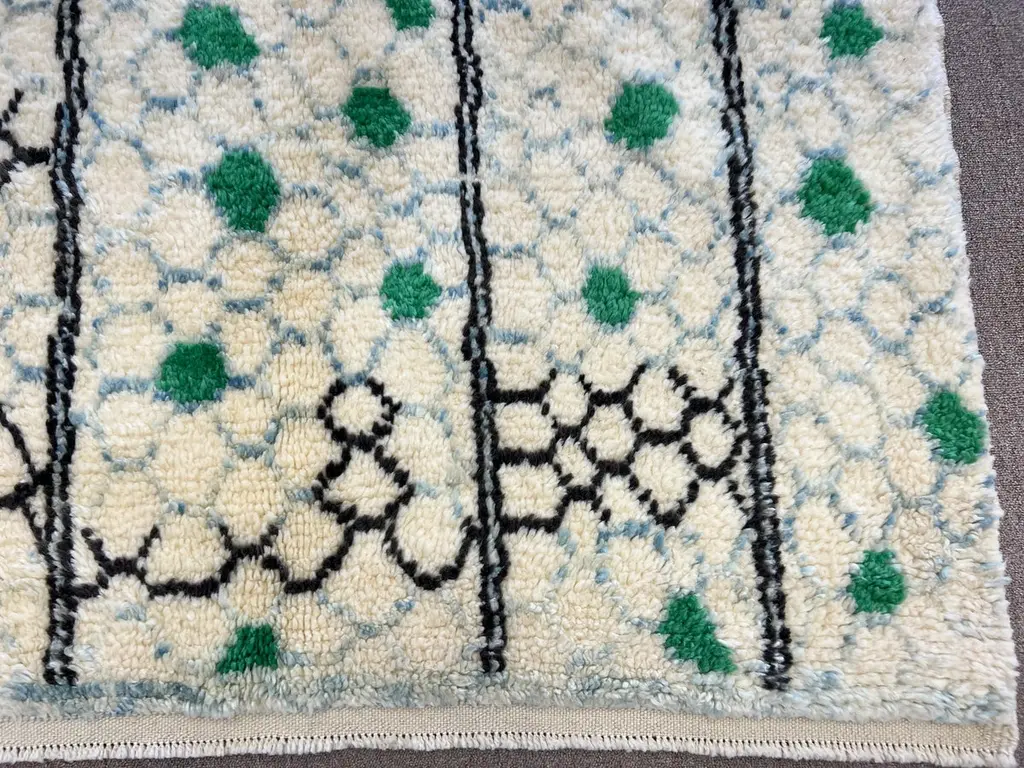 This contemporary hand-knotted wool rug, woven by master artisans in Turkey, takes inspiration from traditional Moroccan weaving while presenting a modern abstract design. The composition combines freeform geometric motifs with playful color accents in green, orange, purple, and black, layered over an ivory ground. Its bold yet organic pattern recalls mid-century Moroccan Beni Ourain and abstract art influences, making it equally suitable for contemporary interiors and eclectic spaces.Crafted from 100% wool with a dense, durable pile, the rug balances softness underfoot with long-lasting strength. Measuring 8 x 10 ft, it is a versatile size for living rooms, dining areas, and open-plan spaces.•Origin: Turkey (Moroccan-style weave)•Age: Contemporary, 21st century•Material: 100% hand-knotted wool•Design: Abstract Moroccan-inspired geometric composition•Condition: ExcellentCustom sizes, colors, and designs can also be produced upon request with a lead time of 4–6 weeks.