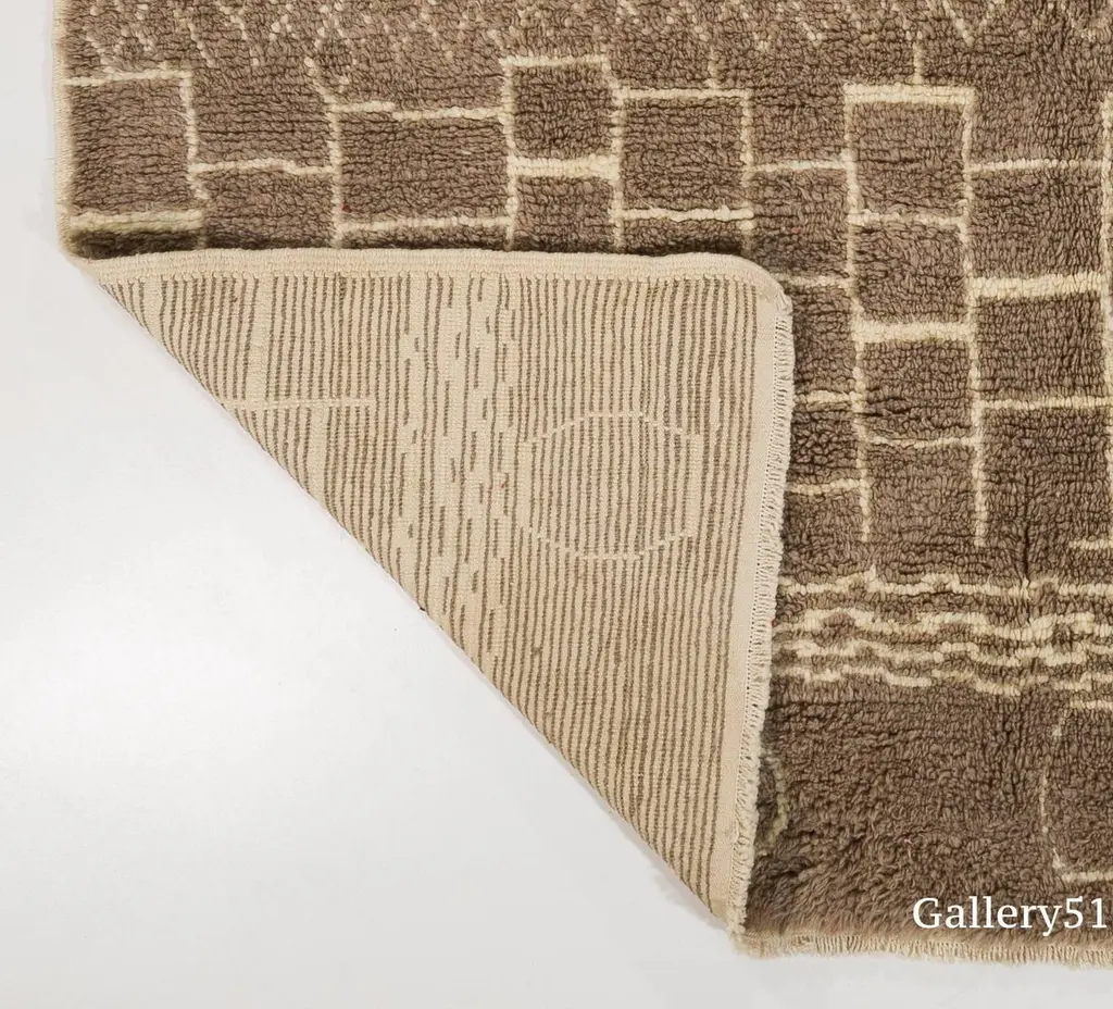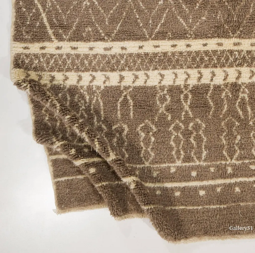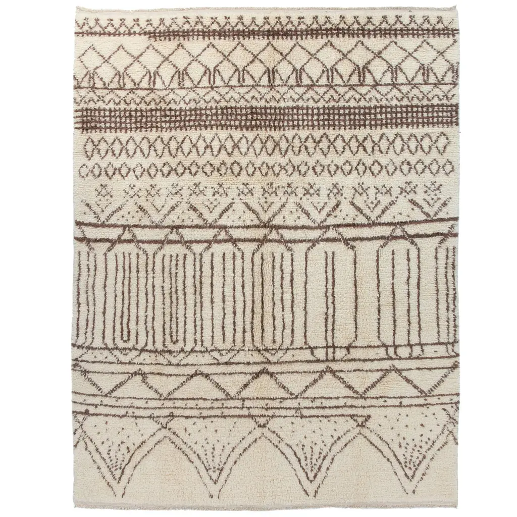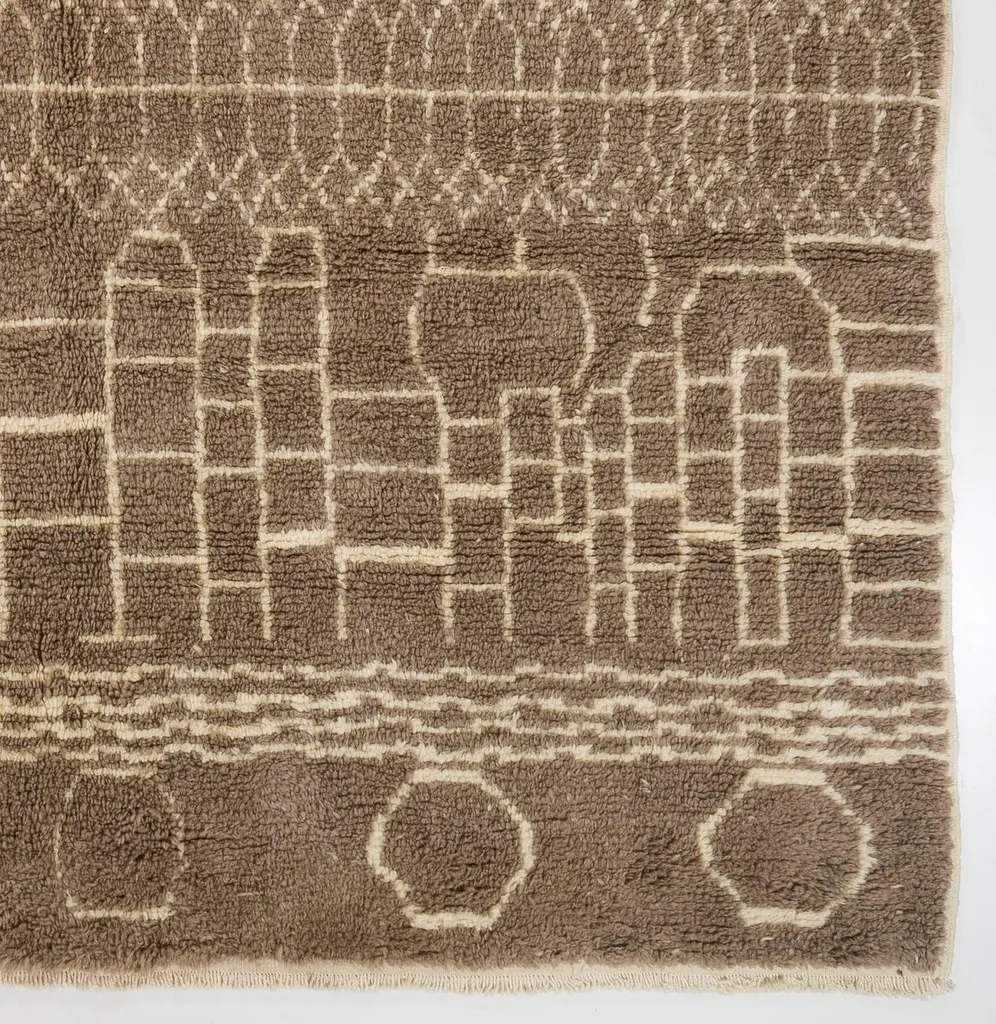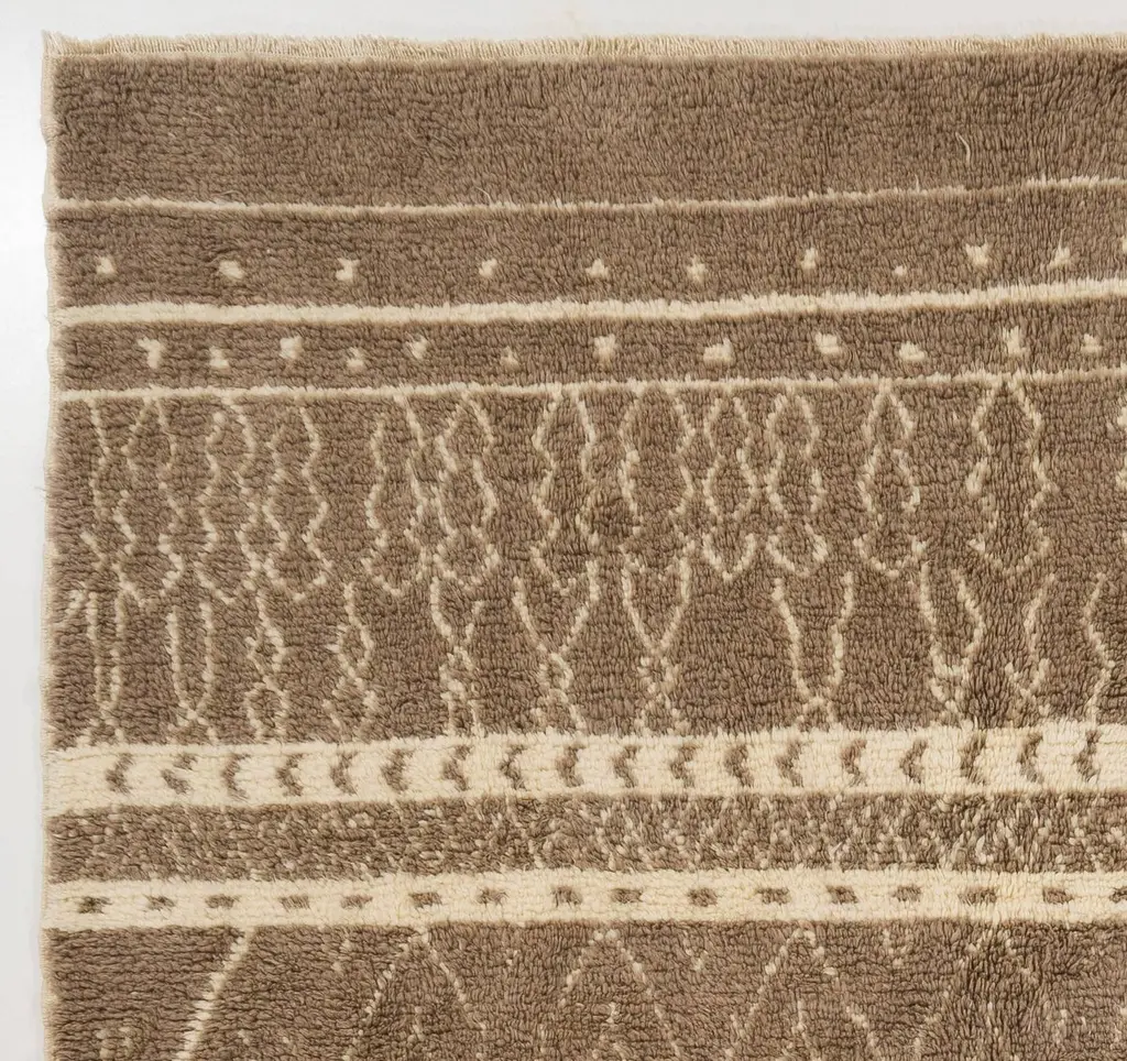 This contemporary Moroccan-style rug is handwoven from 100% natural wool, showcasing a warm taupe ground accented with ivory tribal and geometric motifs. The design features a rhythmic balance of abstract lines, diamond lattices, and architectural-like forms, creating both visual interest and a soothing sense of order. Its earthy palette makes it versatile and easy to integrate into a wide range of interiors, from modern minimalist spaces to eclectic bohemian homes.Soft underfoot with a medium pile height, this rug offers both comfort and durability, making it ideal for living rooms, bedrooms, or statement spaces. Its timeless Moroccan-inspired motifs give it the character of an heirloom piece while remaining contemporary in execution.In addition to the size shown, this rug can be custom produced in any dimensions, colors, design variations, pile height, and fringe length to meet the exact needs of your interior project.