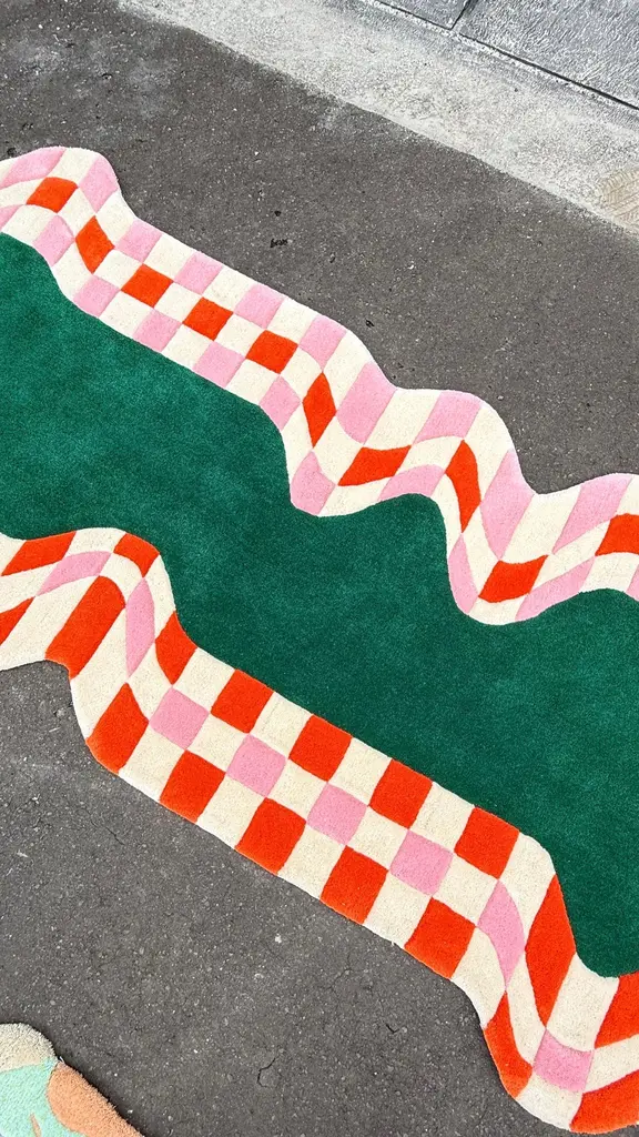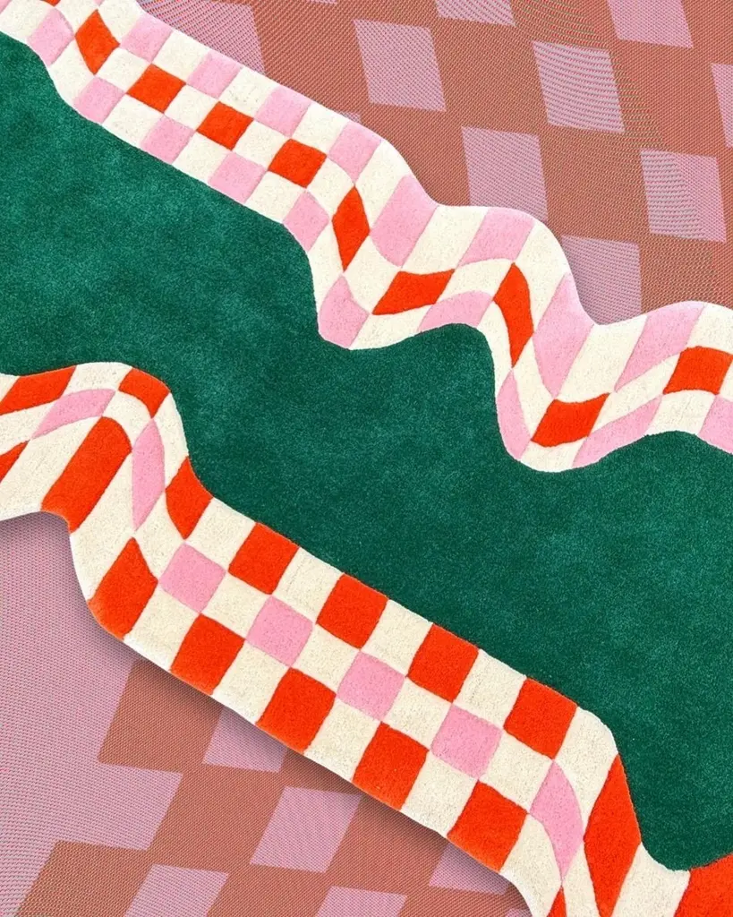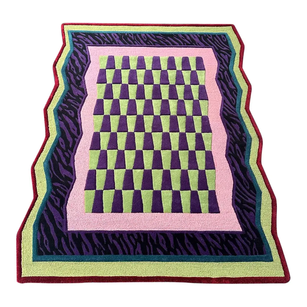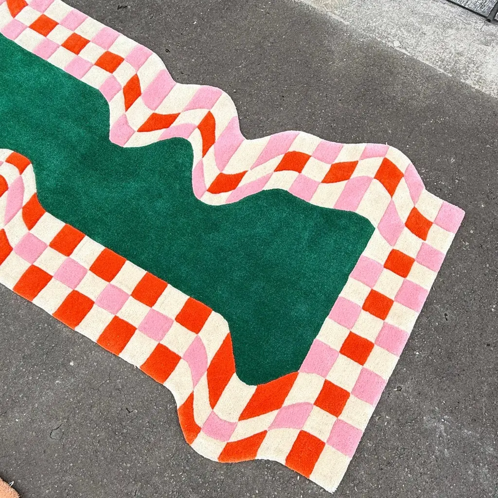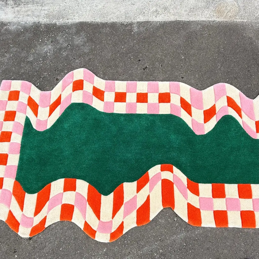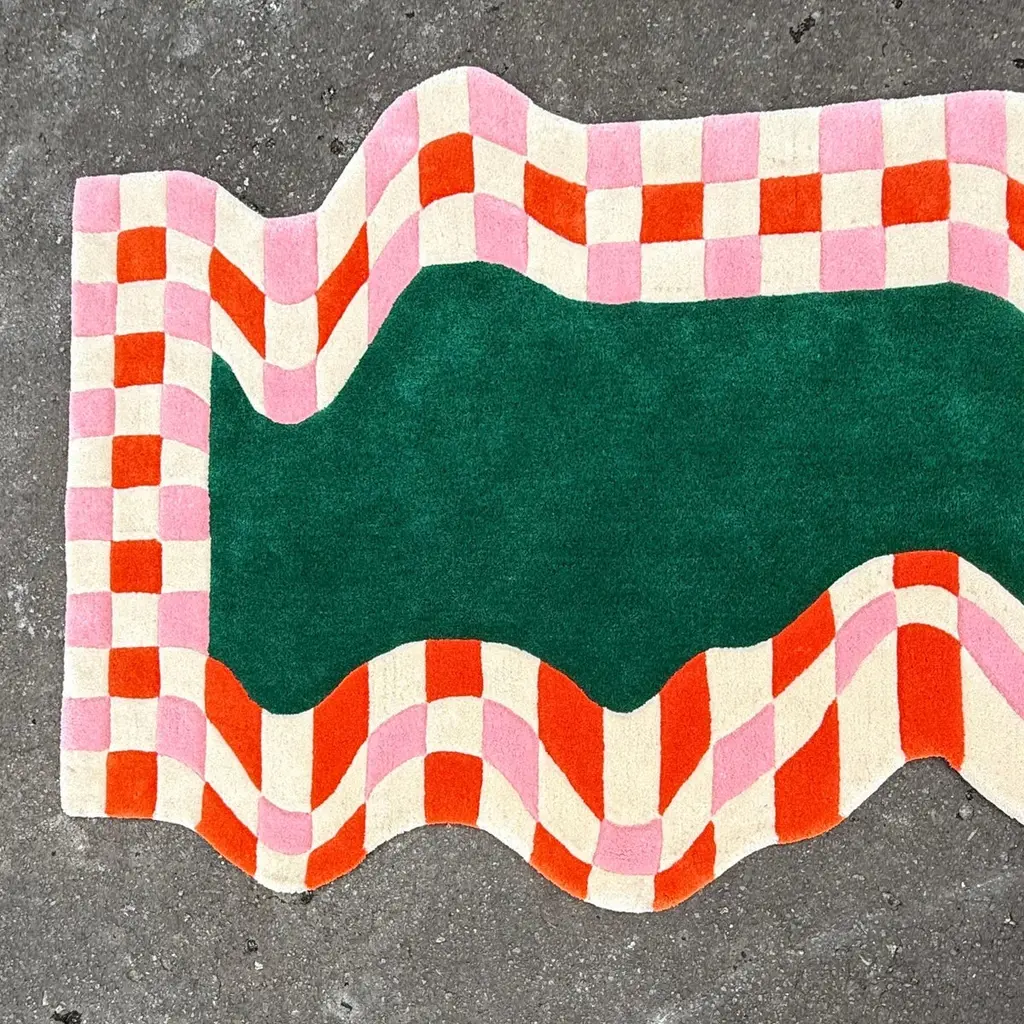 This contemporary rug reimagines the classic checkered motif with a playful twist. A bold red-and-pink checkerboard flows along wavy edges, framing a rich green center that instantly commands attention. Its organic silhouette and vibrant palette make it both whimsical and striking—an artwork for the floor.Hand-tufted in Indonesia by skilled artisans, the rug is crafted from a wool and acrylic blend that combines softness underfoot with enhanced durability and easy maintenance. The sculpted tufting emphasizes the fluid edges and creates subtle dimension within the design.Perfect for eclectic, modern, or artistic interiors, this piece works beautifully as a focal point in a living room, dining area, or creative studio.Details:•Material: Wool and acrylic blend•Technique: Hand-tufted with carved detailing•Colors: Red, pink, cream, green•Shape: Rectangular with wavy organic edges•Condition: New, made to order•Custom sizes and colors available