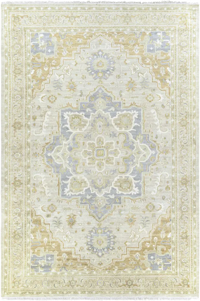 Collection: Convent Colors: Mustard, Sage, Olive, Cream, Light Sage, Tan Construction: Hand Knotted Material: 100% Wool Pile: Low Pile Pile Height: 0.07" Styles: Traditional Made In: India Thickness: 0.24" Fringe Length: 1" Price Range: $$$$$ (Premium)