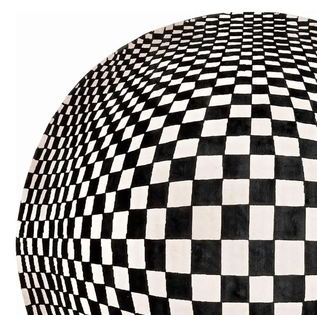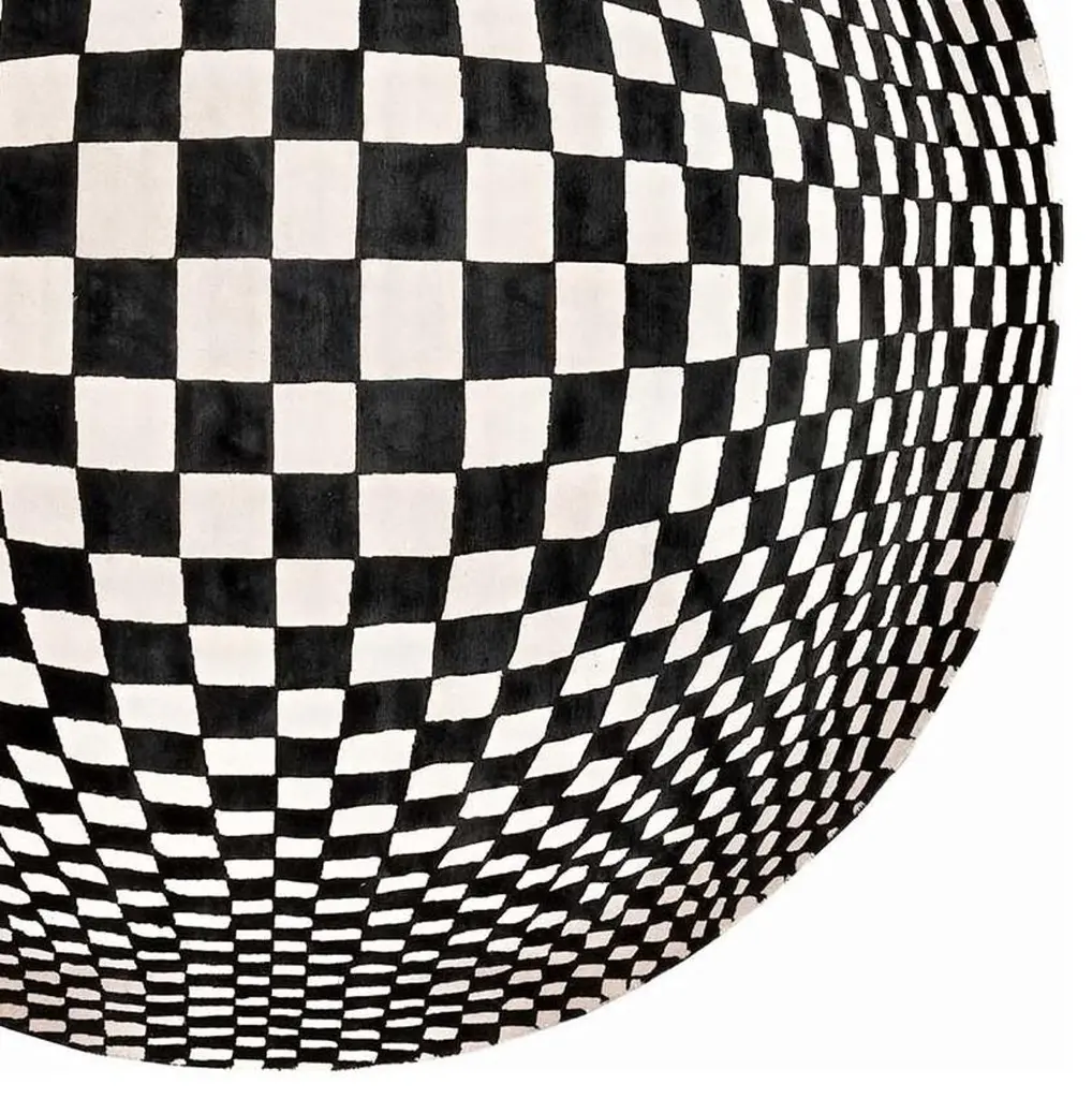 Part of the Design collection, this striking rug will be an eye-catching accent in a contemporary interior. It is hand knotted in Nepal by master artisans of 100% silk with 152,000 knot/sqm. The base is .05 cm high, while the design is .07 cm high, featuring an impressive combination of black and white geometric elements that create a stunning optical illusion. Each piece is customizable in size, color, and composition.