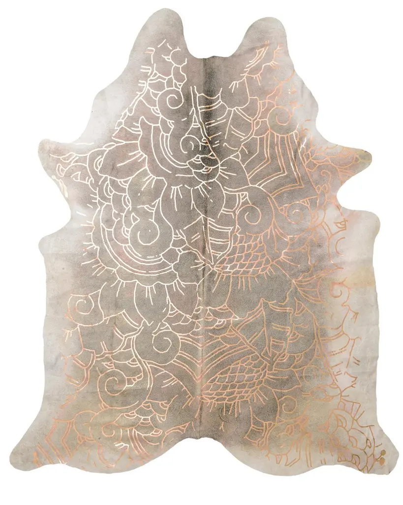Copper Metallic Boho Batik Pattern Gray Cowhide Rug, Large