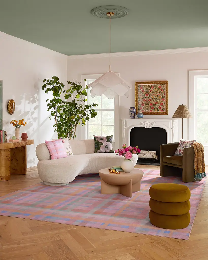 A fun, contemporary take on classic plaid, our Cora Multicolor Pink Rug features painterly layers that gently overlay ribbons of soft hues. The color palette blends soft pinks, cream, dusty red, lavender, and a pop of powder blue. Water-resistant, stain-resistant, and machine-washable. Rug colors may vary slightly according to your device and the lighting in your space.