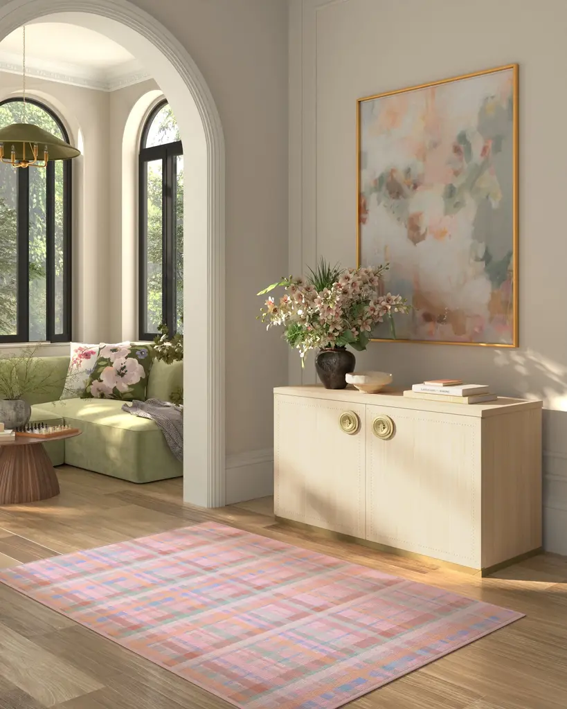 A fun, contemporary take on classic plaid, our Cora Multicolor Pink Rug features painterly layers that gently overlay ribbons of soft hues. The color palette blends soft pinks, cream, dusty red, lavender, and a pop of powder blue. Water-resistant, stain-resistant, and machine-washable. Rug colors may vary slightly according to your device and the lighting in your space.