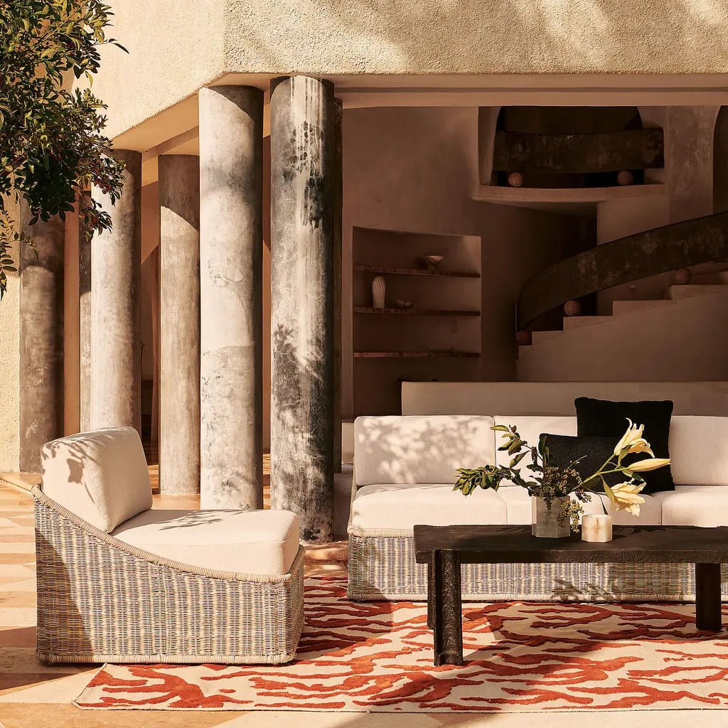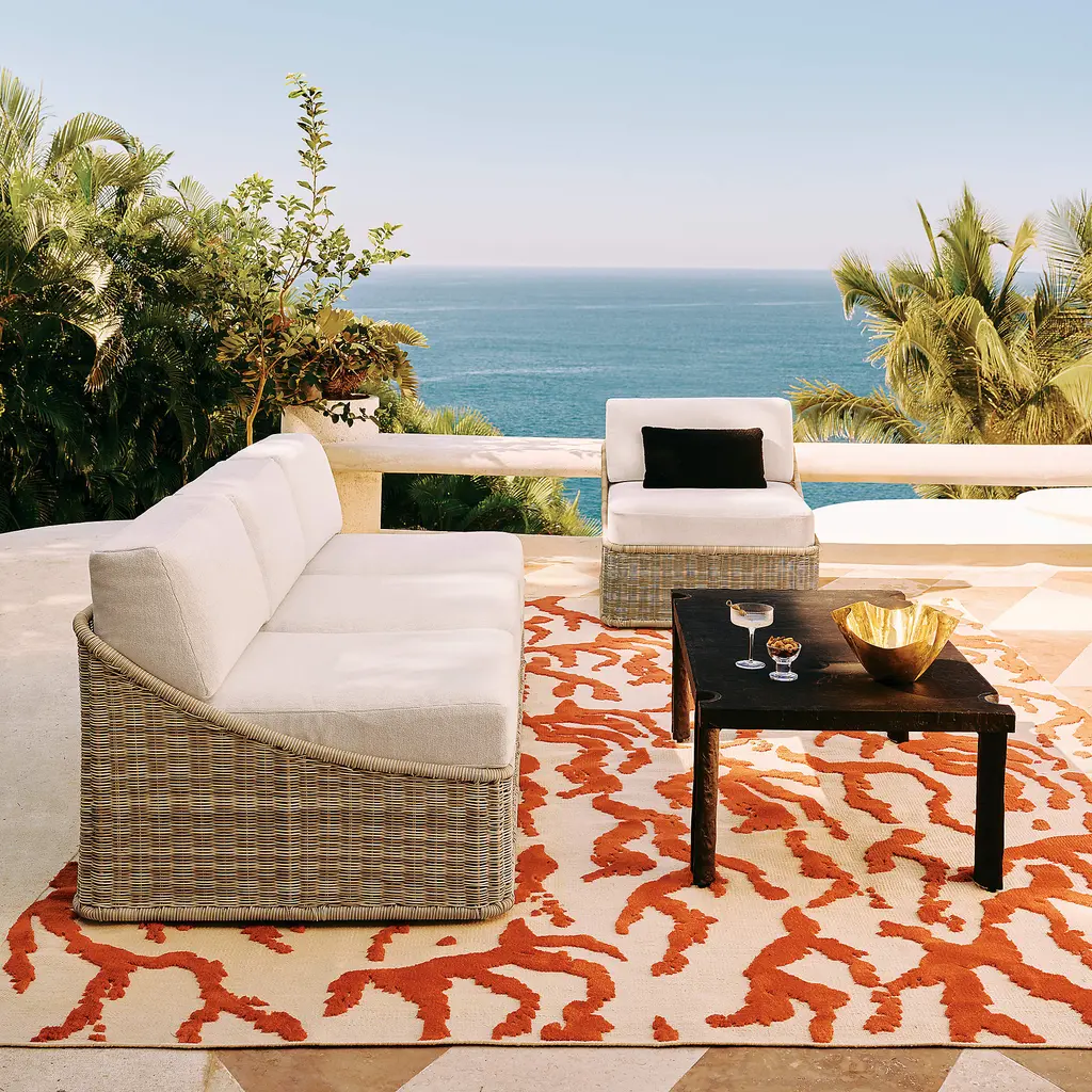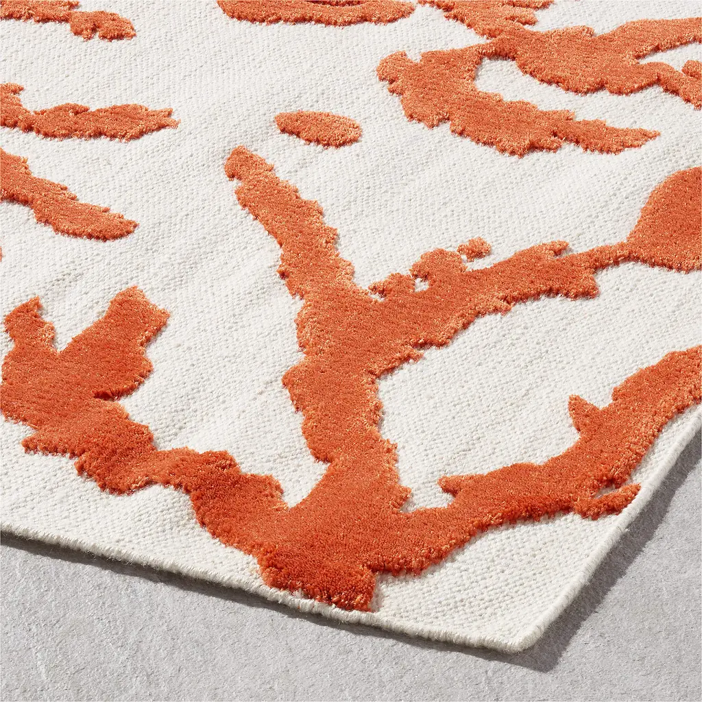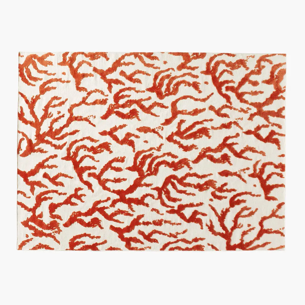 Indoor/outdoor rug by Ross Cassidy is crafted by hand, one knot at a time. High-low pile puts all eyes on coral shapes in fiery red over a cream base, creating an energetic tonal combination translated from Cassidy's original sketches and watercolors. It's well-suited for medium- to high-traffic spaces such as sunrooms, patios and entryways. CB2 exclusive.