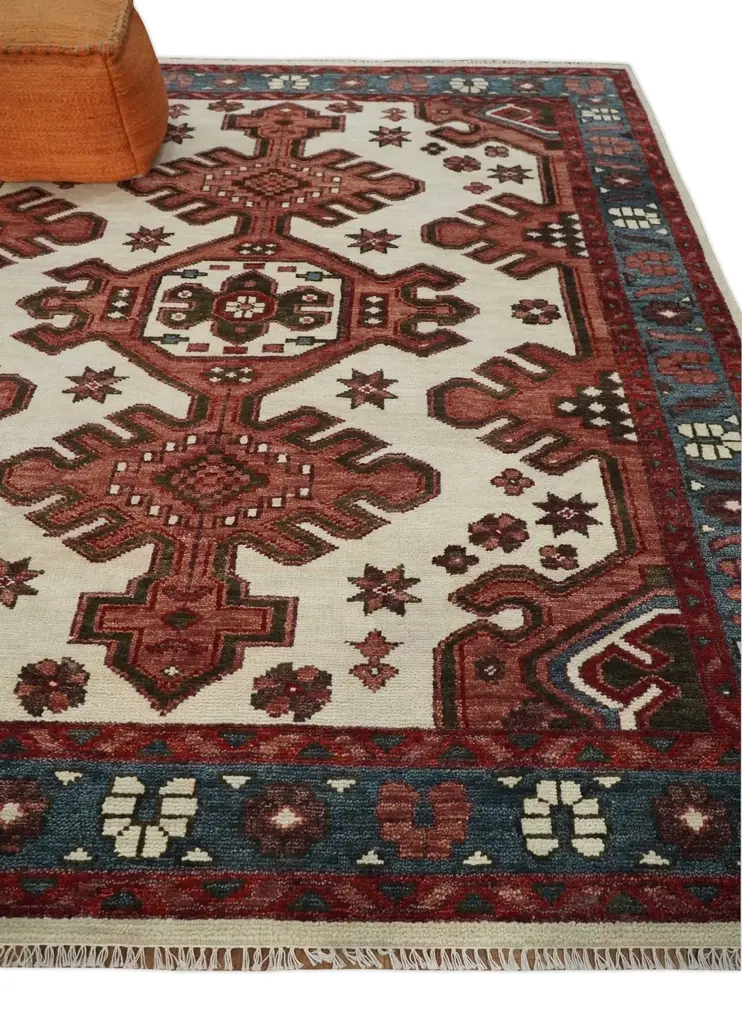This Hand-Knotted Rug has been Made with Handspun Wool. The beautiful colors of the rug carry a legacy of the famous Heriz rug, the traditional design of the rug completes your space without making it look busy. Heriz rugs are durable and can last for decades if treated right. Hand-Knotted Made with Soft Wool Color: Coral Rust and Gray Made with 22 knots per square inch Made to order in 30 - 60 days Hand Knotted rugs have been made for centuries and carry a tradition and art. This specific rug is made in India, in the city of Bhadohi. Bhadohi is one of the biggest rug manufacturing cities. Carpet weaving in the region dates back to the 16th century during the reign of Akbar. The skilled artisans of Bhadohi have been carrying the tradition of rug-making for centuries. USERS GUIDE Avoid prolonged moisture Vacuum regularly and/or shake to remove dust Do not pull any loose threads. Use scissors to simply cut the ends Blot spills immediately with a white cloth. Harsh chemicals may damage or fade the rug Use rug protectors under heavy furniture