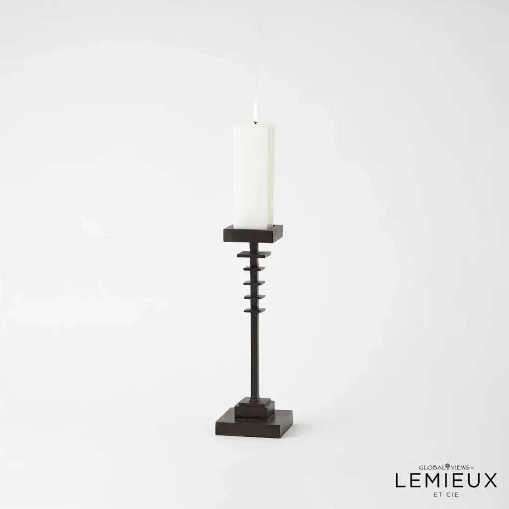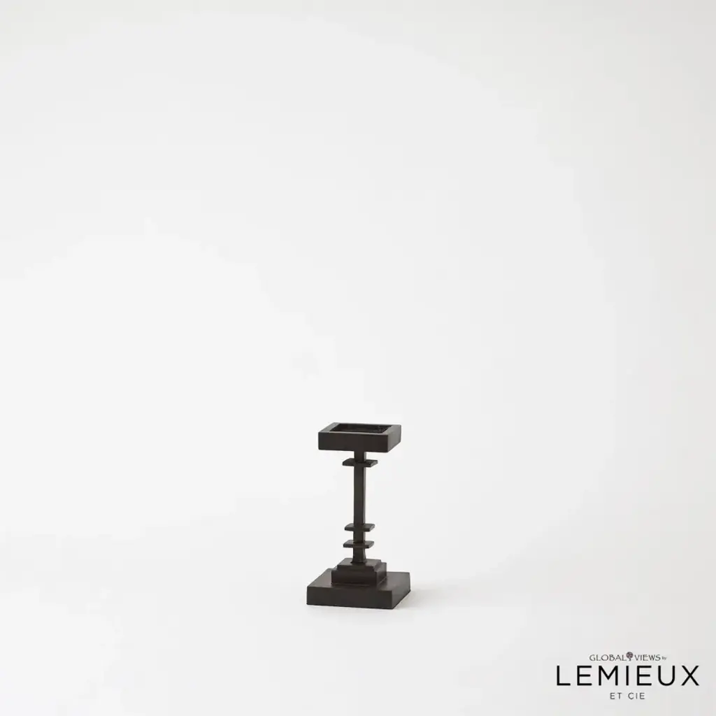 The Corentin Candle Holder showcases a blend of strength and design. Crafted with precision, its stepped design adds a dynamic visual element, creating a sense of depth and dimension. The dark finish accentuates the forged metal texture, making it a captivating centerpiece that effortlessly makes any decor and brings a warm and inviting glow to any space. From a fashion forward perspective, Global Views offers accessories, furniture, statement lighting, and an assortment of rugs and mirrors to add beauty and joy to your home.