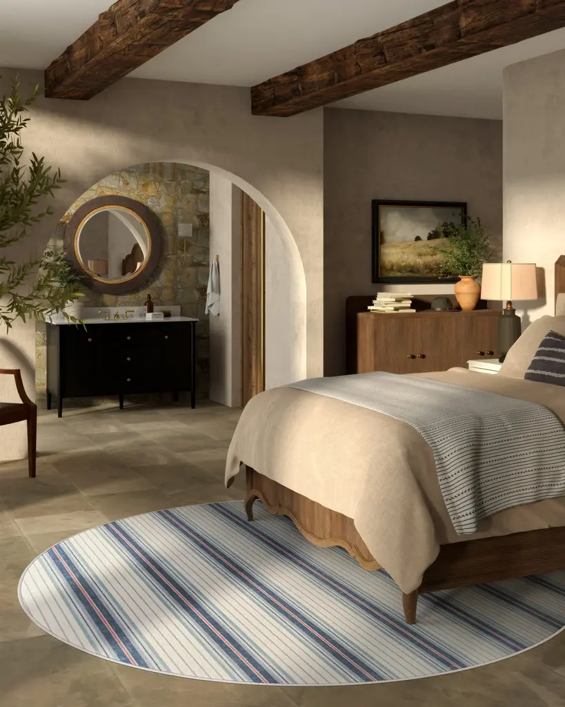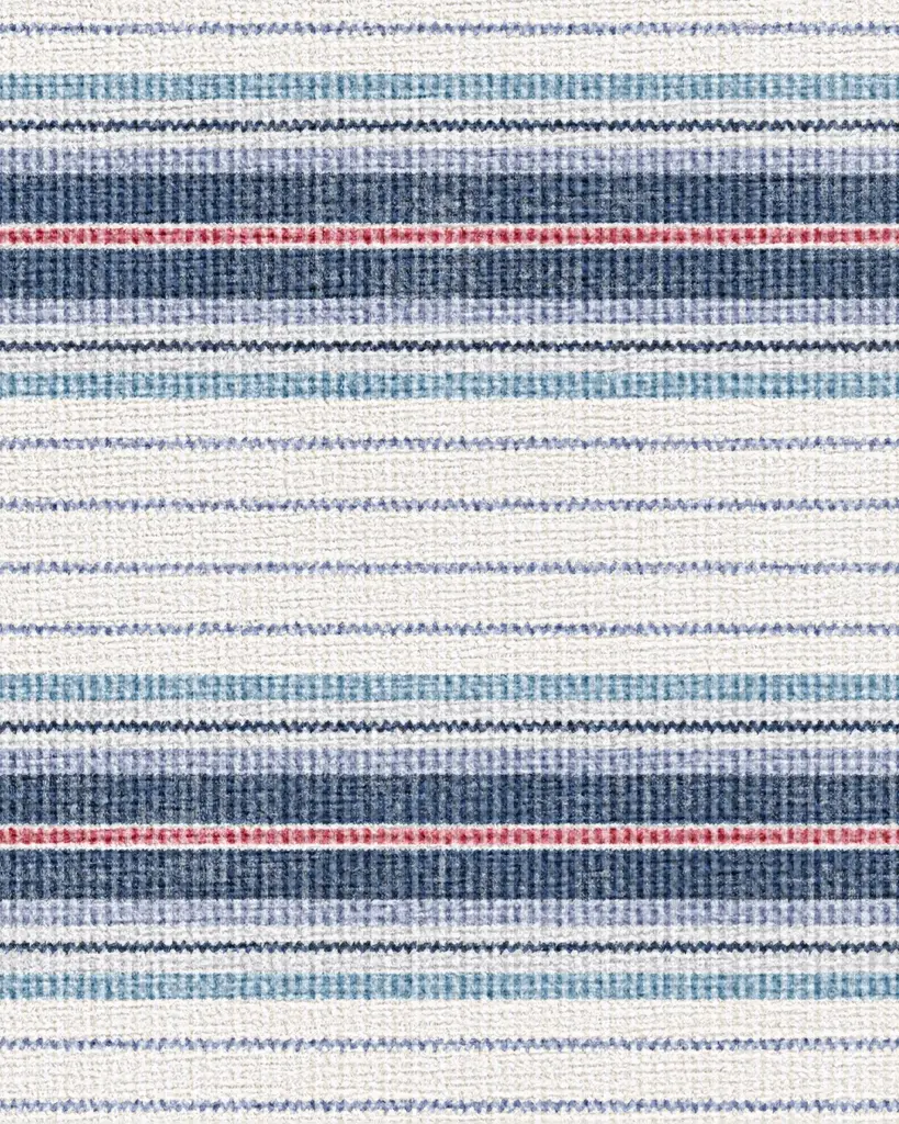Inspired by traditional fine-striped designs, our Cosette Stripe Ivory & Indigo Rug offers a coastal-inspired aesthetic with vertical stripes in contrasting tones of navy blue and slate blue against an off-white background. A fine red accent stripe provides a pop of color throughout the pattern. Water-resistant, stain-resistant, and machine-washable. Rug colors may vary slightly according to your device and the lighting in your space.