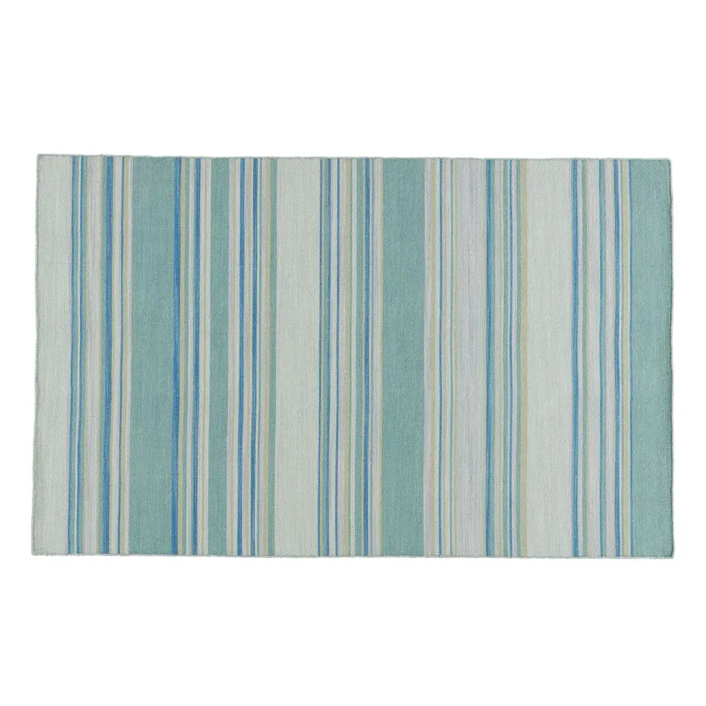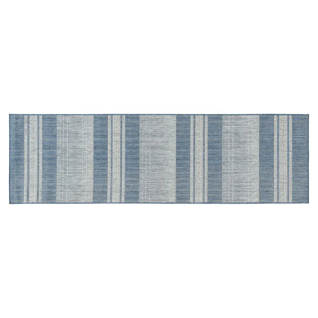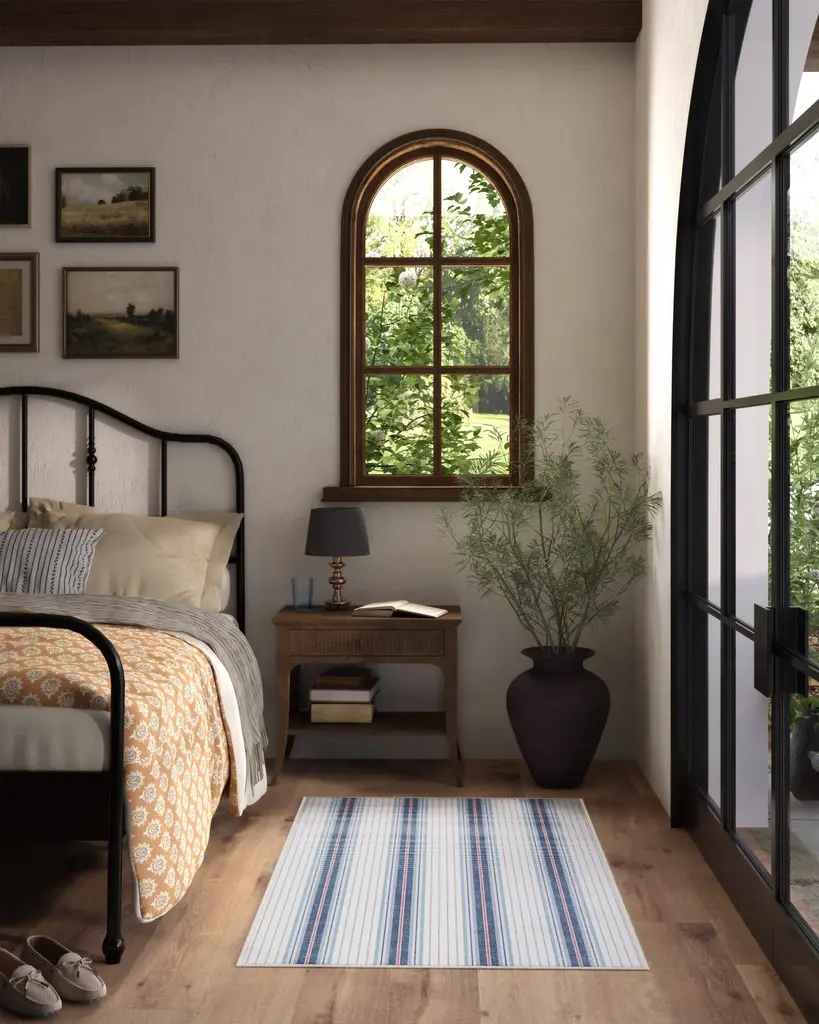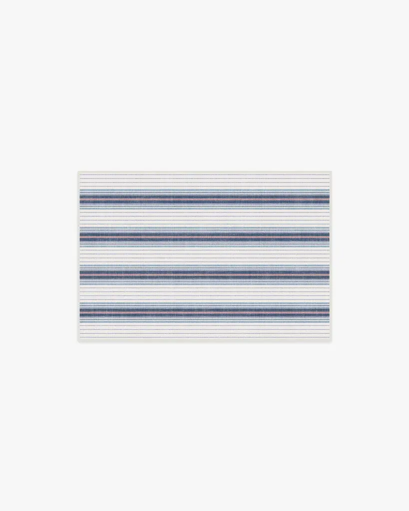 Inspired by traditional fine-striped designs, our Cosette Stripe Ivory & Indigo Rug offers a coastal-inspired aesthetic with vertical stripes in contrasting tones of navy blue and slate blue against an off-white background. A fine red accent stripe provides a pop of color throughout the pattern. Water-resistant, stain-resistant, and machine-washable. Rug colors may vary slightly according to your device and the lighting in your space.