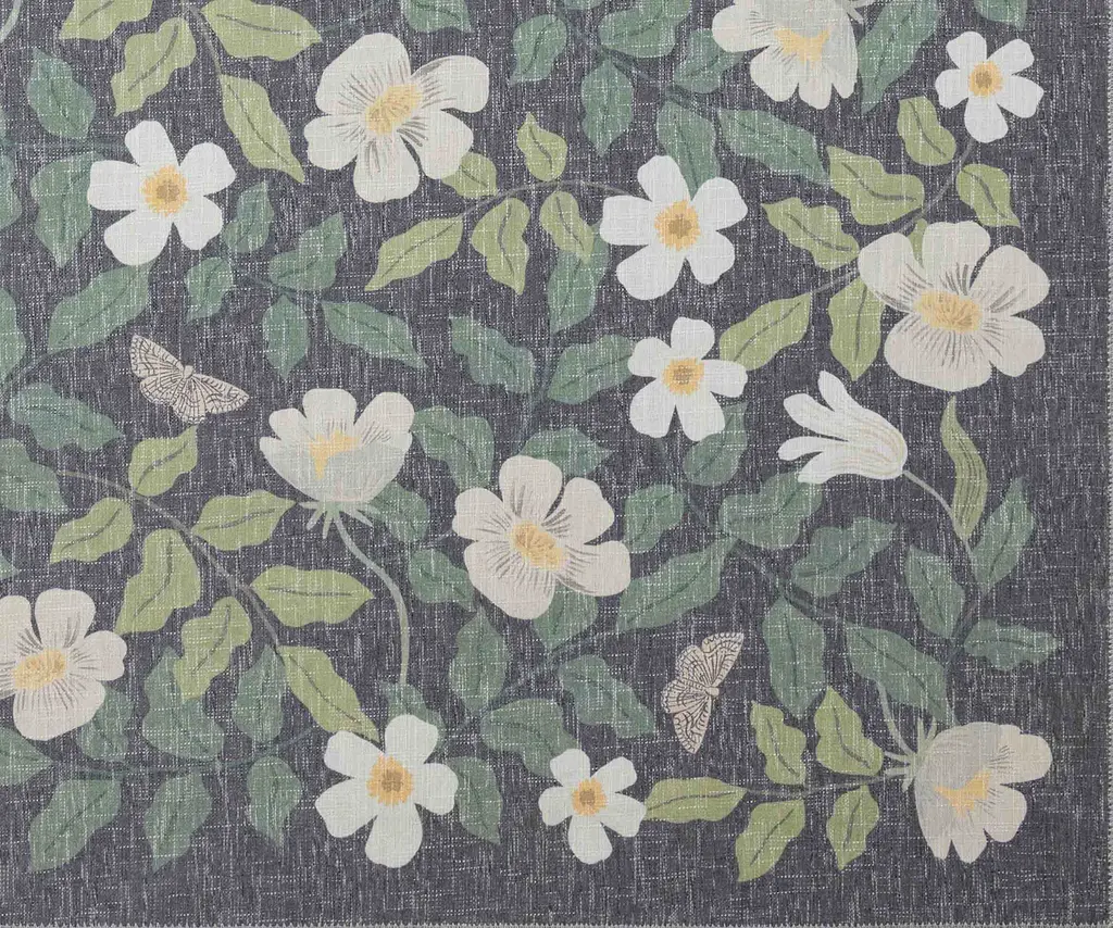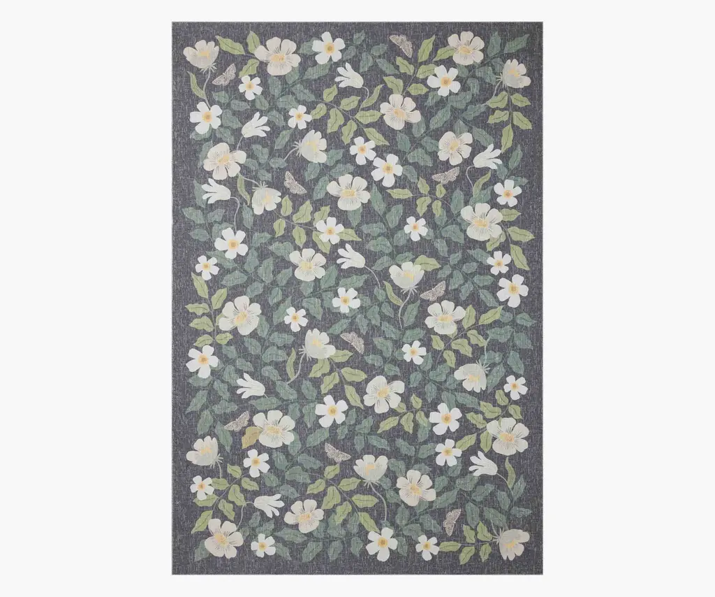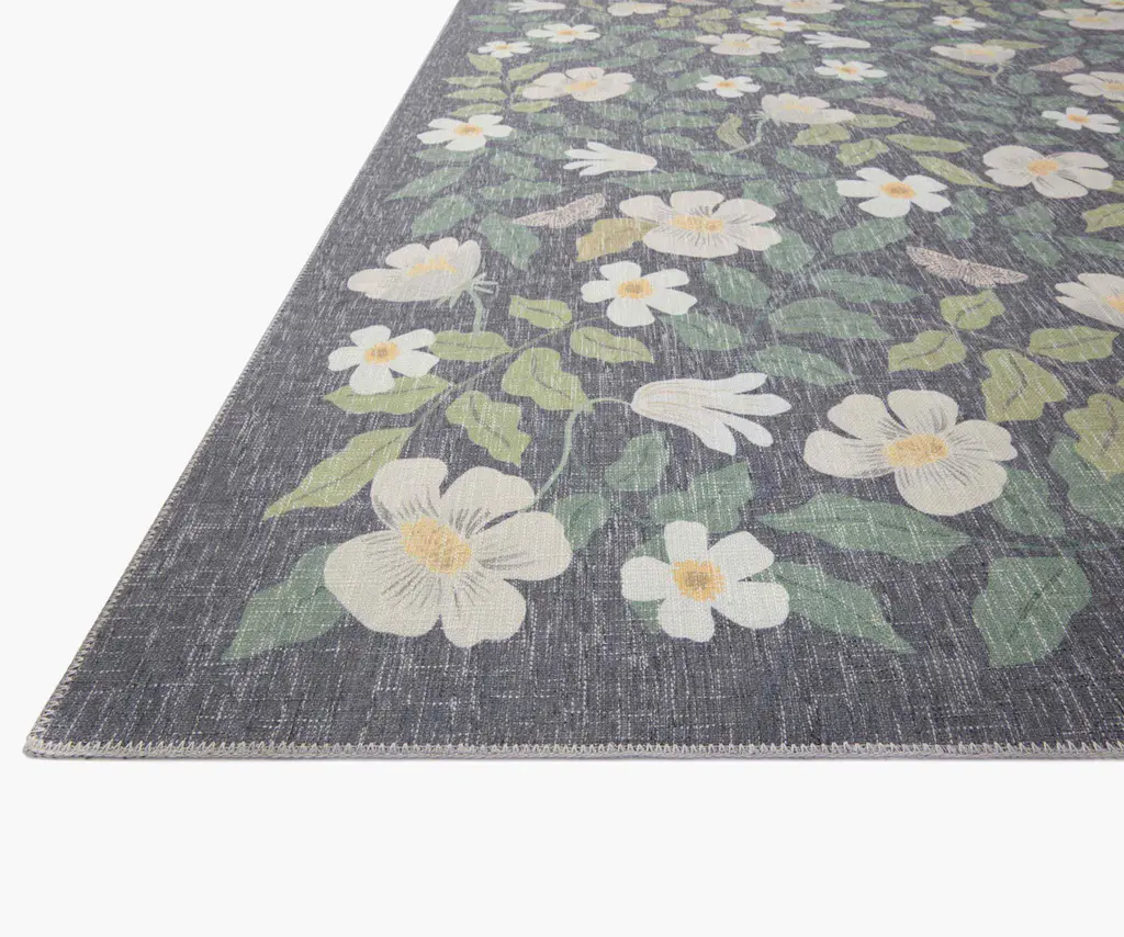 Butterflies flutter among a tangle of delicate leaves and flowers in full bloom on our Primrose rug. This printed rug is powerloomed of 100% polyester pile and designed to withstand foot traffic. Part of our Rifle Paper Co. × Loloi collection. The layout and scale of our rugs is adjusted to accommodate each available size, and may be different than what is pictured here. Images of each size are available by hovering over the desired size on our desktop site.