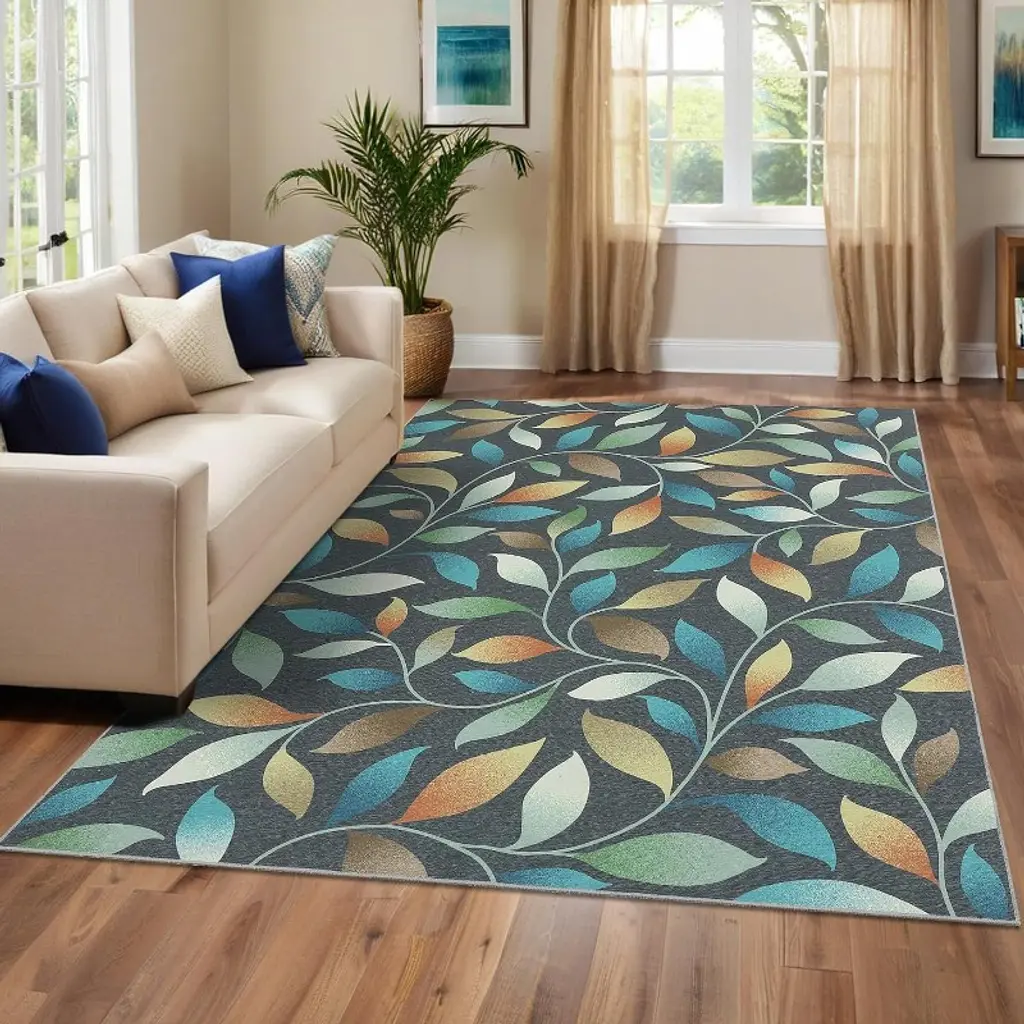 Coucheta Botanical Area Rug - Washable Leaf Print Rug, Non-slip Low Pile Indoor Carpet For Living Room & Office, Machine Washable(5*7ft,blue)