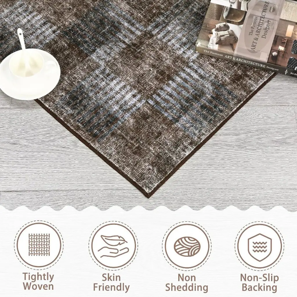 Coucheta Washable Area Rug - Non-slip Modern Checkered Rug, Stain Resistant Low Pile Carpet For Living Room & Bedroom, Plaid Design(5*7ft,brown)