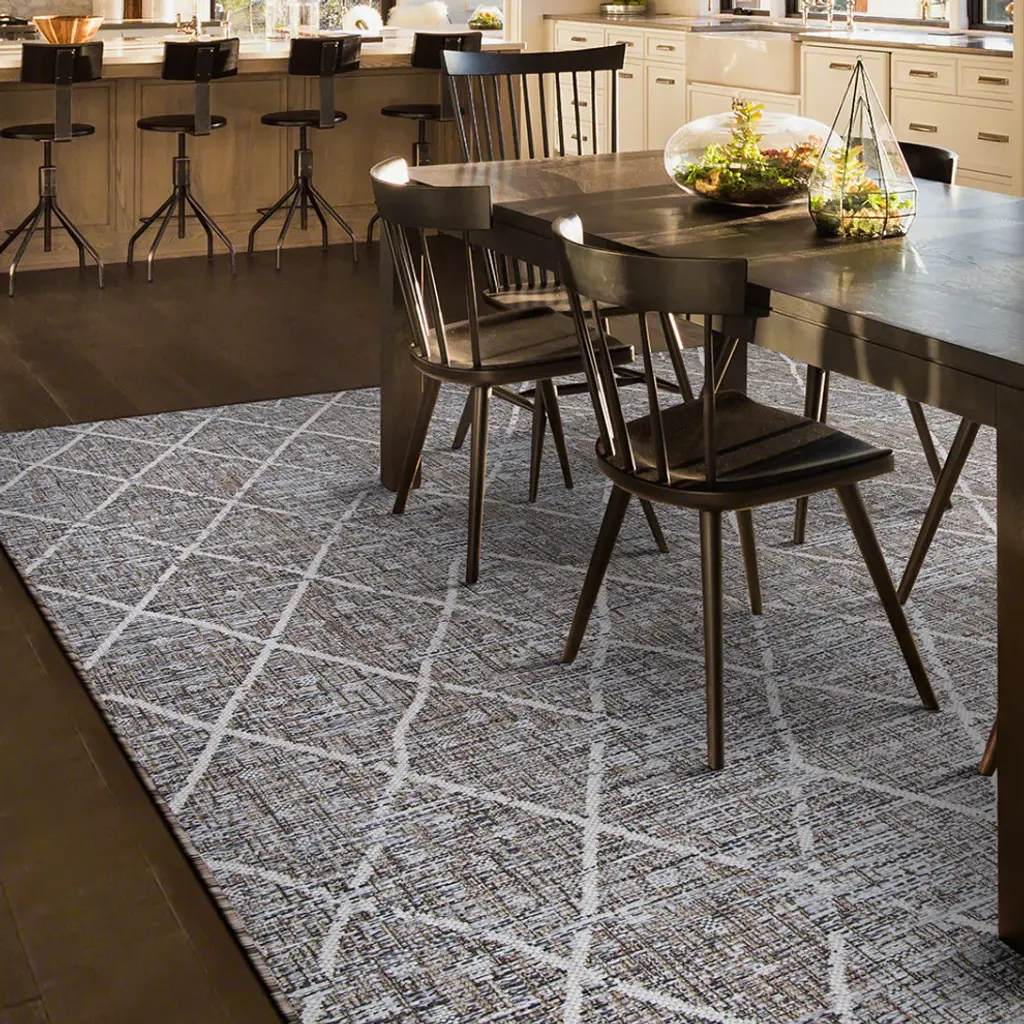 Couristan"™s innovative design team brings yet another level of fashion to the outdoor/indoor category with its Charm Collection. Showcasing a 100% heat-set Courtron™ polypropylene surface that is space-dyed for an added blending of colors, these versatile area rugs combine fashion with function. Suitable for outdoor use, Charm area rugs feature a traditional structured flat woven construction and are mold, mildew and water resistant as well as UV stabilized for long-lasting color retention. Perfect for any sun-soaked location, like decks and pool-side seating areas, these durable area rugs require minimal care and are easy to clean. Sophisticated and dramatic, these eye-catching designs can also be used in indoor spaces that receive a lot of wear and tear. Perhaps its most attractive quality, every area rug included in the Charm Collection contains recyclable materials. Decorating an outdoor environment or an indoor oasis with eco-sensibility is a universal fir for any household.