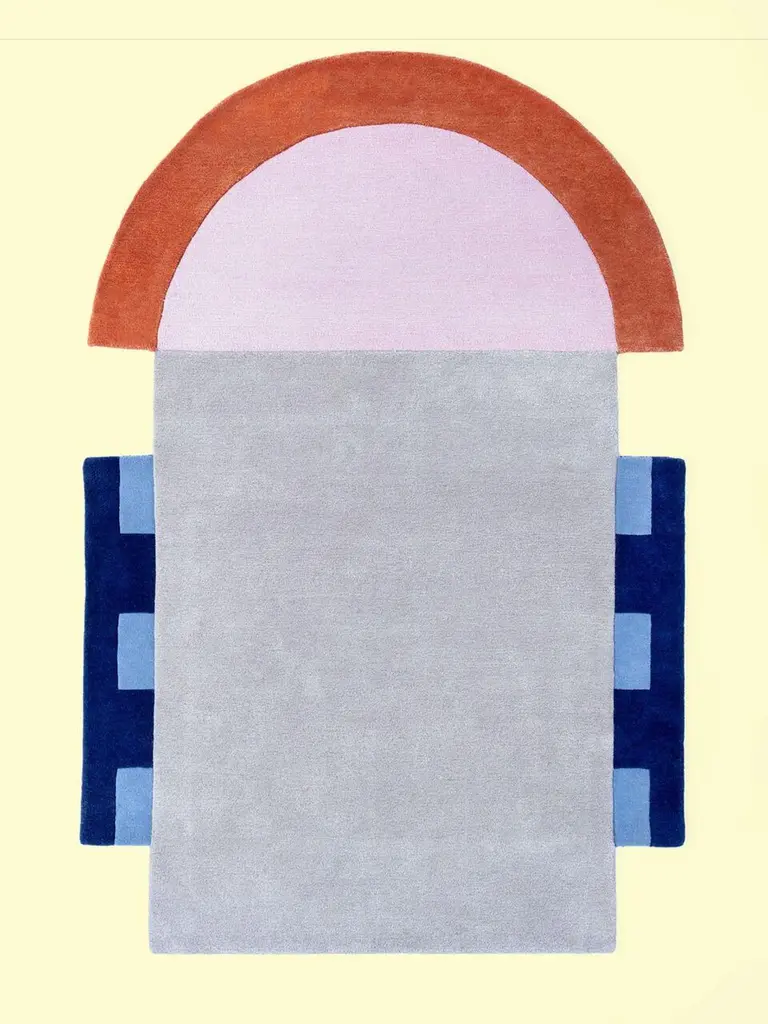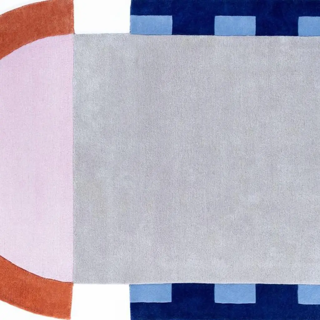 The “Court Series” rugs are hand-tufted with blended wool and viscose material dyed in hyper-saturated colors, with tennis court-like geometries represented both via overlaid graphics as well as the cut and shape of individual segments.Custom sizes are available. Made by hand in India.
