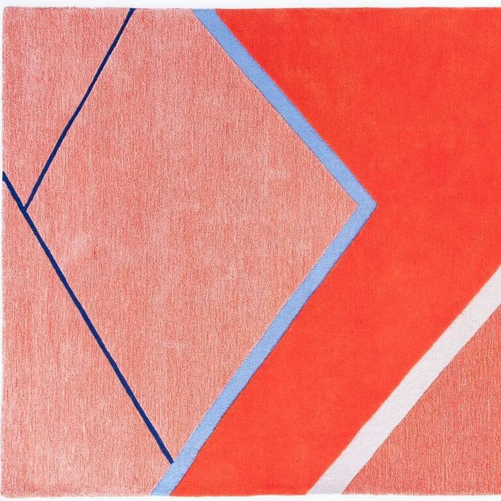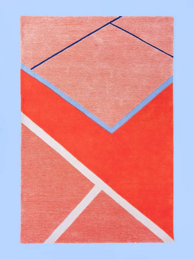 The “Court Series” rugs are hand tufted with blended wool and viscose material dyed in hyper-saturated colors, with tennis court-like geometries represented both via overlaid graphics as well as the cut and shape of individual segments.Custom sizes are available. Made by hand in India.