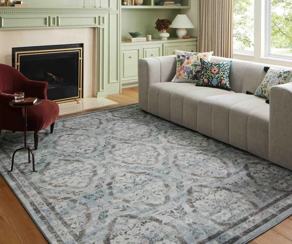 An offset grid of floral medallions creates the illusion of a curved ogee pattern on our Courtyard Chateau rug, available in both deep colorways and elegant pastels. The Courtyard collection was made with Loloi's CloudPile construction, an incredibly soft fabrication that combines the best of affordable printed rugs with the plushness of a pile. Part of our Rifle Paper Co. × Loloi collaboration. The layout and scale of our rugs is adjusted to accommodate each available size, and may be different than what is pictured here. Images of each size are available by hovering over the desired size on our desktop site.
