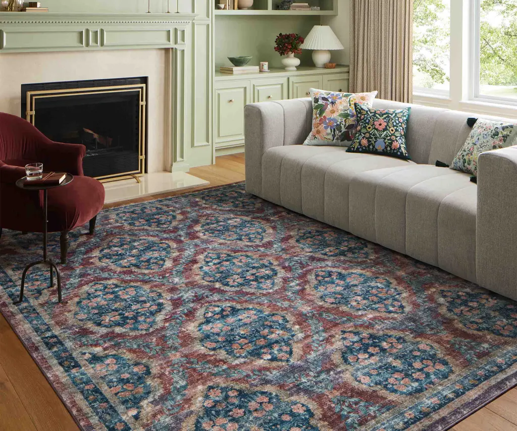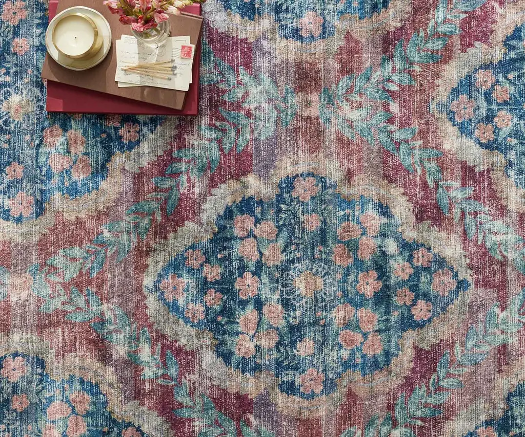 An offset grid of floral medallions creates the illusion of a curved ogee pattern on our Courtyard Chateau rug, available in both deep colorways and elegant pastels. The Courtyard collection was made with Loloi's CloudPile construction, an incredibly soft fabrication that combines the best of affordable printed rugs with the plushness of a pile. Part of our Rifle Paper Co. × Loloi collaboration. The layout and scale of our rugs is adjusted to accommodate each available size, and may be different than what is pictured here. Images of each size are available by hovering over the desired size on our desktop site.