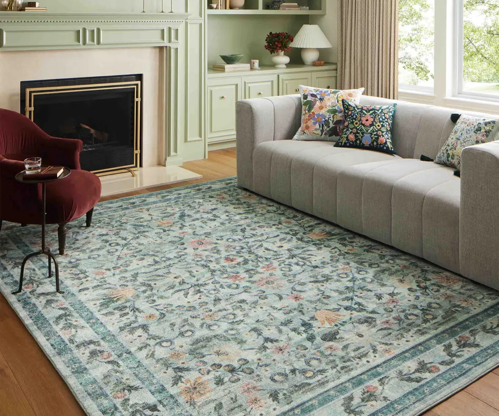The floral design of the Eve rug almost creates a compass rose, with statement blooms facing in the four cardinal directions, surrounded by a detailed border. The Courtyard collection was made with Loloi's CloudPile construction, an incredibly soft fabrication that combines the best of affordable printed rugs with the plushness of a pile. Part of our Rifle Paper Co. × Loloi collaboration. The layout and scale of our rugs is adjusted to accommodate each available size, and may be different than what is pictured here. Images of each size are available by hovering over the desired size on our desktop site.