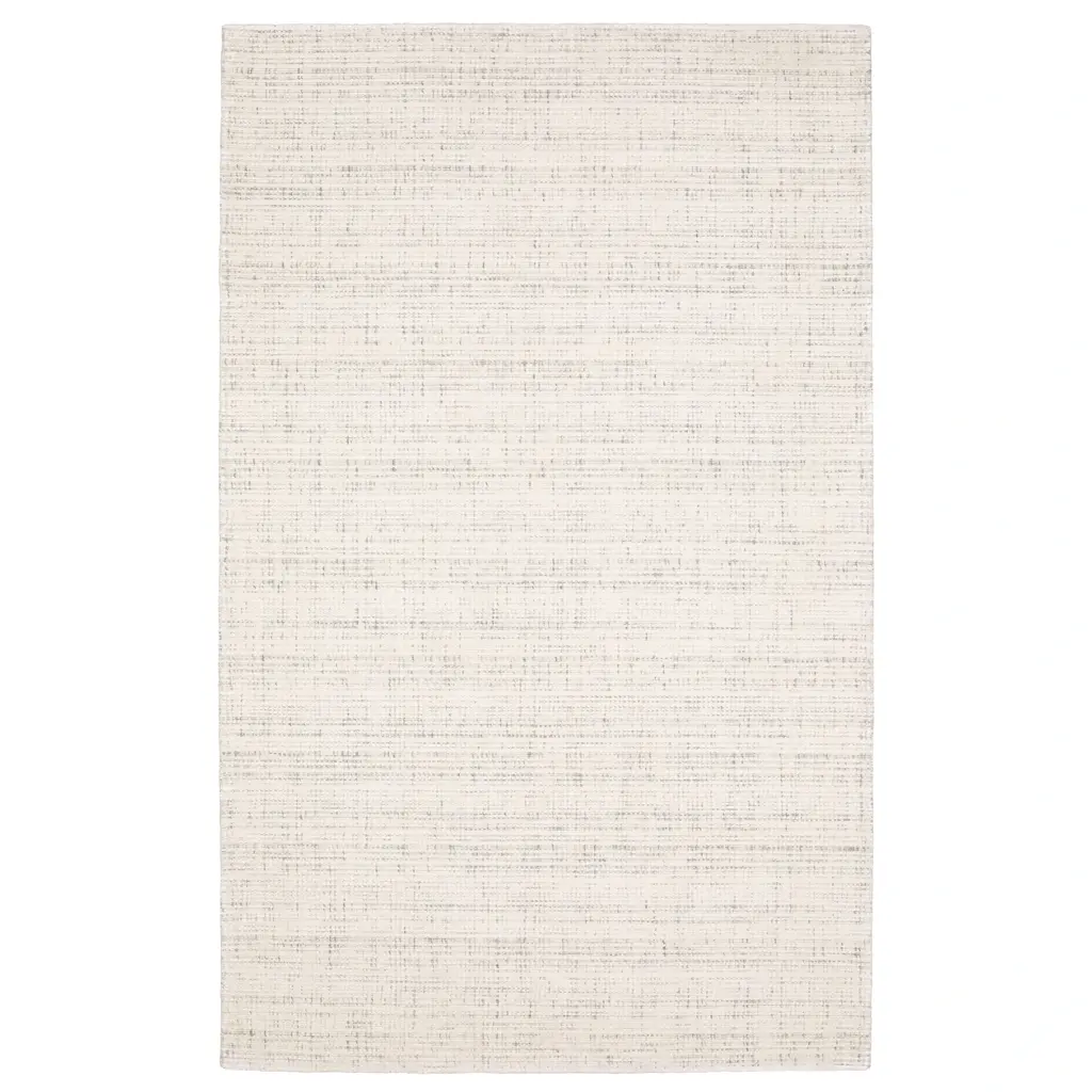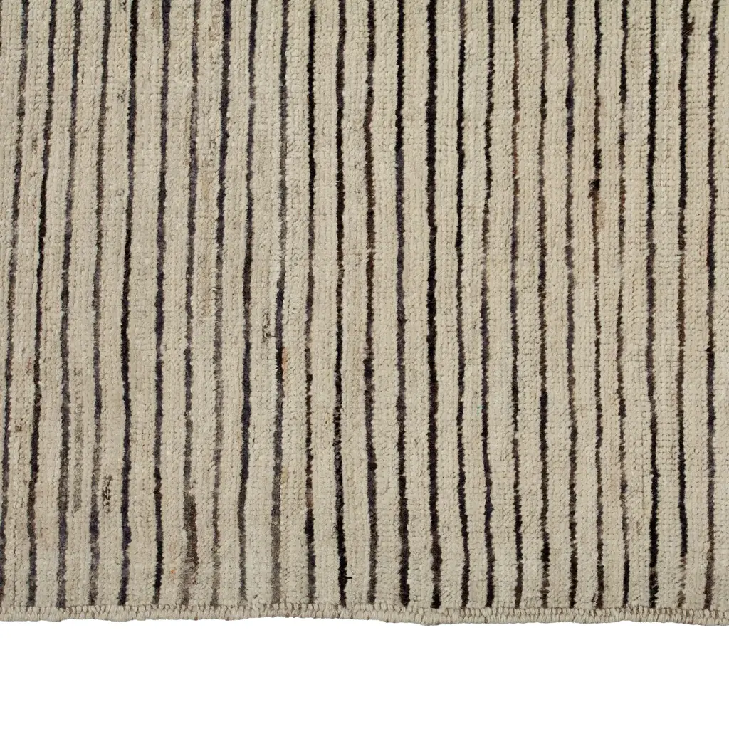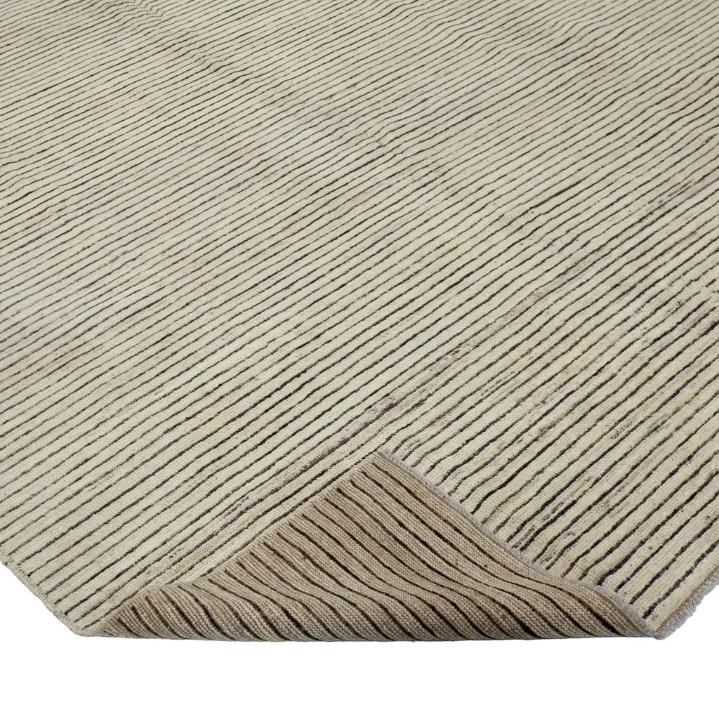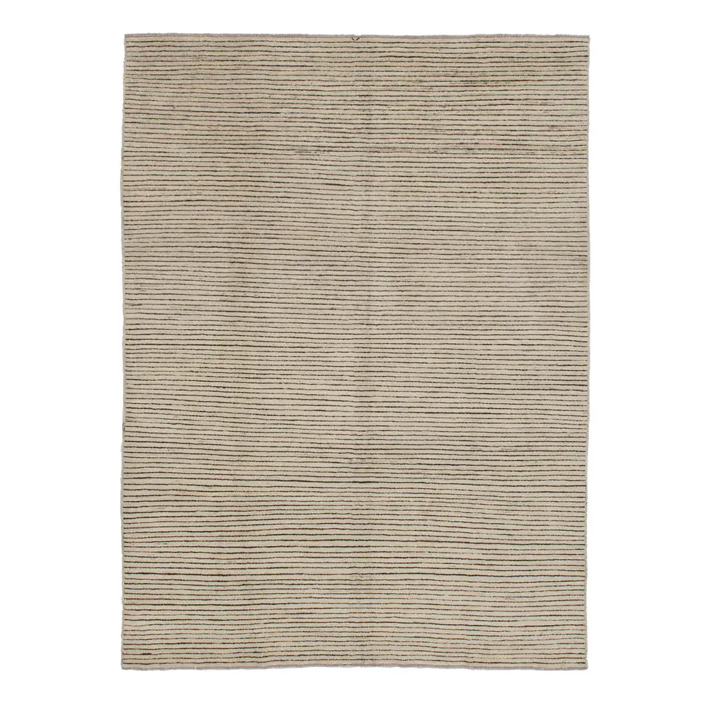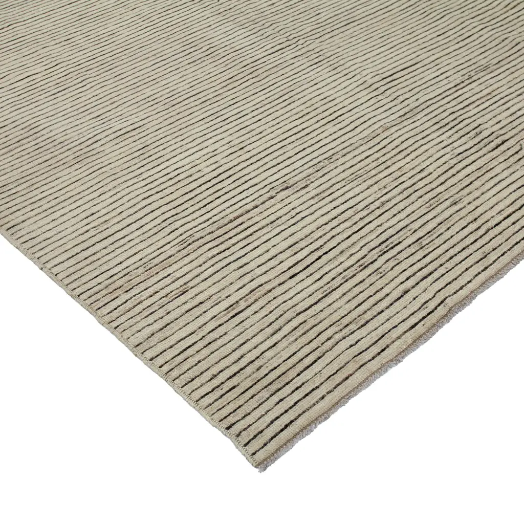 Inspired by the grounding foundations of Earth's natural colors and pure materials, this Zameen Cream Solid Modern Wool Rug - 7'8" x 10' features a shifting solid design in varying shades of cream with a darker backdrop that is reminiscent of a sandy desert while paying homage to traditional rug designs of history's past. The neutral color palette in this textured wool rug is made from a unique blend of recycled wool that comes from the sheering of other plush wool rugs and hand-spinning the remnants into a one-of-a-kind combination of colors. Hand-knotted in Central Asia by small collectives of rug artisans who are given artistic freedom to create unique motifs, this one-of-a-kind rug will be celebrated for centuries with its compelling textured design elements, sturdy construction, and impactful presence in any living room, dining room, or bedroom.