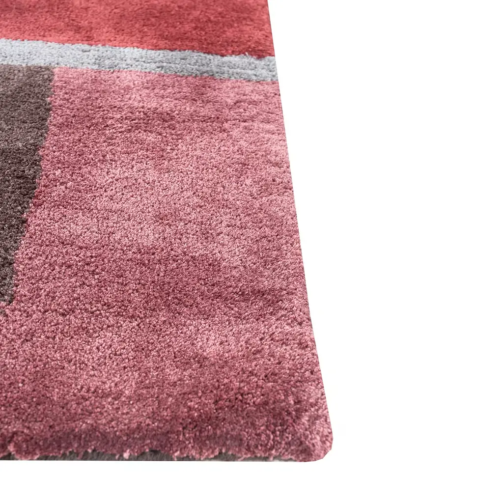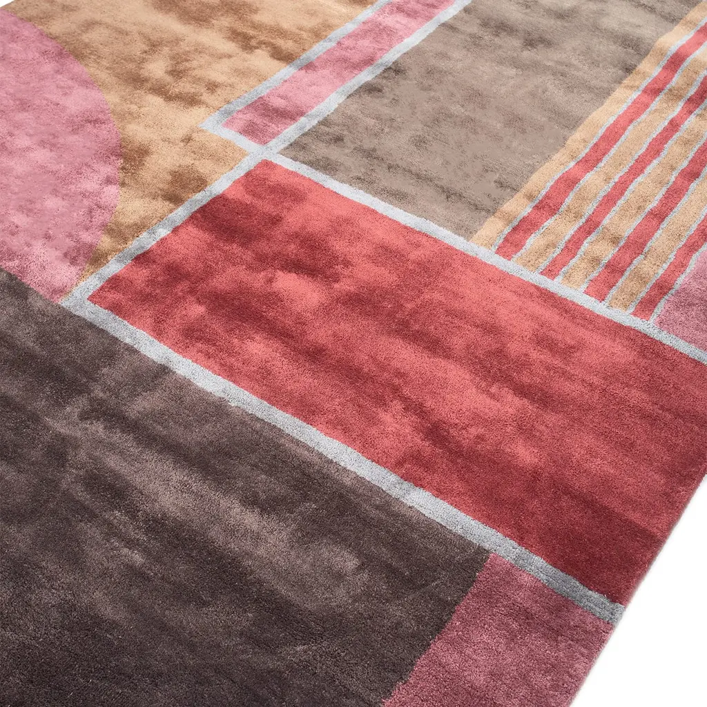 This meticulously hand-tufted area rug blends artistry with precision, crafted from 80% viscose for softness and sheen, and 20% cotton for durability and comfort. The viscose catches the light, enhancing the rug’s visual appeal, while the cotton ensures strength. Its abstract design of geometric shapes and lines exudes a contemporary aesthetic. With a unique silhouette combining straight edges and curves, the rich earthy tones add modern flair. Available in various colors, shapes, and sizes.