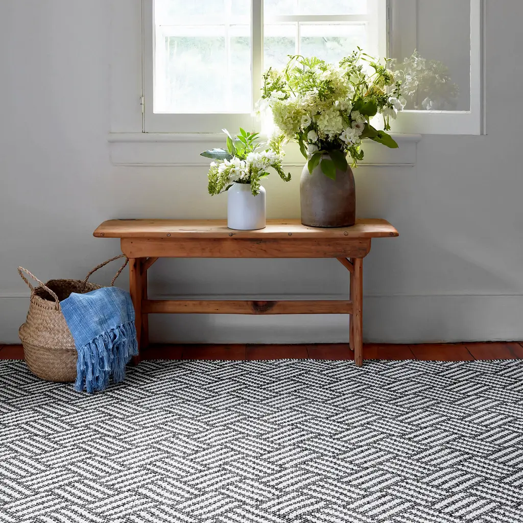 A diagonal basket weave of graphic stripes made of durable and washable polypropylene can withstand the elements and combat years of wear and tear. Perfect for use on the porch or patio, it dries quickly and won't fade in the sunshine or mildew in the shade. Easy to care for and enjoy for many seasons to come.