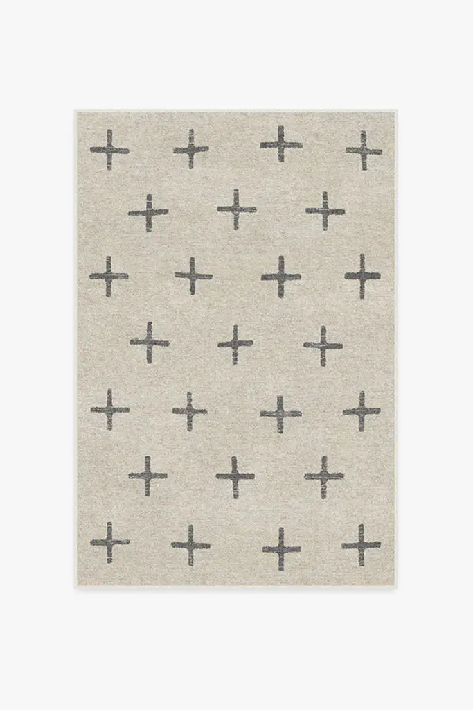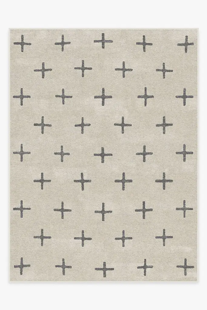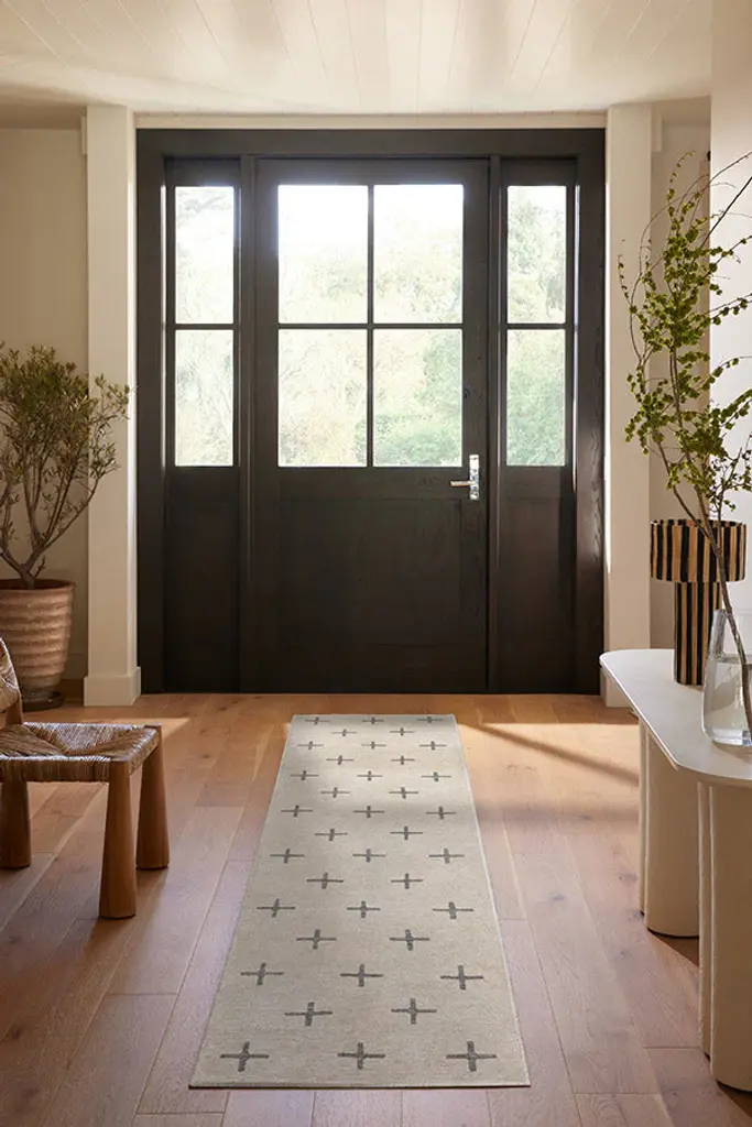 Stay light on your feet with our Crosby Birch & Charcoal Rug. Inspired by the iconic Nordic Cross found in Scandinavian art, this decorative design features charcoal, hand-drawn motifs scattered against a greyish-white background. Water-resistant, stain-resistant, and machine-washable. Rug colors may vary slightly according to your device and the lighting in your space.