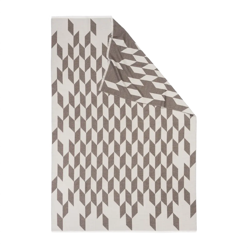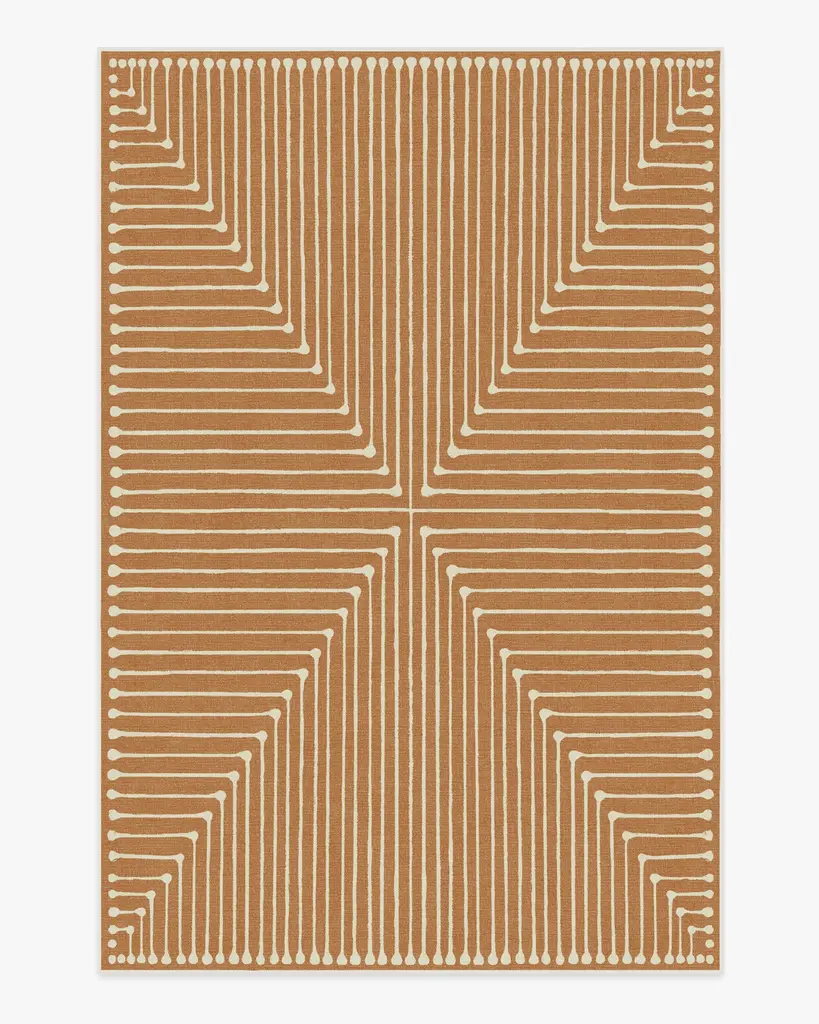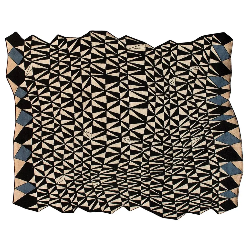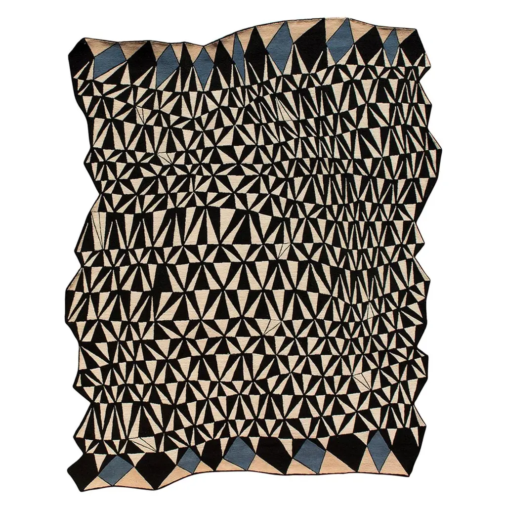 This unique wool and viscose rug is handknotted into an asymmetrical geometrical pattern and is sure to liven up any floor of a home or office space. The rug’s design is divided into alternating rectangular and triangular shapes in beige, light and dark brown, and burgundy.