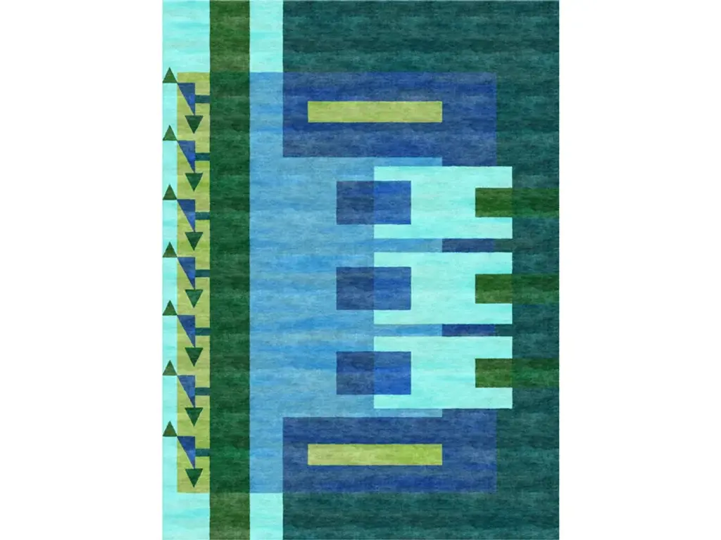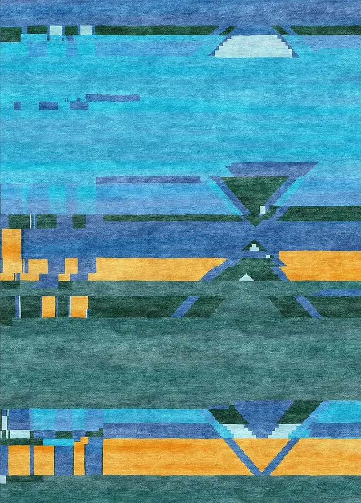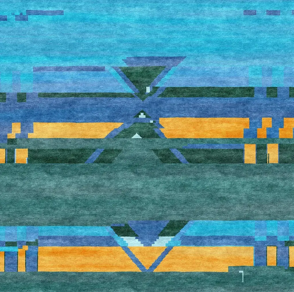 Cryptogram 3 is a rectangular wool rug.Zollanvari Fine Gabbehs.A symbol or figure with secret or occult significance… this design fuses two common patterns in Persian Gabbehs in three layers: rhombus medallions (double triangles symbolising women) and linear borders (a classical element in Iranian weaving) wedged within two layers of horizontal stripes (rectangles symbolising men) of bold colours. The glitch effect enhances the perception of a hidden message… comparable to a shamanic charm? Persian decorative art is awash with spiritual ‘hidden’ missives – stylised, abstract, and often depicted in geometric patterns and forms. This is a Glitch Gabbeh with a subliminal message.The inspiration for this latest collection is an ingenious fusion of traditional Gabbeh iconography and Glitch art – a visual style characterised by using digital or analogue errors for aesthetic purposes, whether that be intentional (that is, “faking glitch” and obtaining a similar aesthetic through design) or by accident (a true manifestation inside of the system without human intervention). The term “glitch” itself originates with engineers and astronauts to explain faults within the technology they were working with. But the visual aesthetic can be traced much further back, to the beginning of the 20th century through distorted forms in cubist paintings, abstract short films and pixel-like rug designs akin to 8-bit video game landscapes. In fact, many antique rugs feature abstract, distorted patterns that seem to predict the glitch movement of later centuries. This new collection, including its marketing and sales, will set off a new Gabbeh revolution. The designs are available in custom and bespoke sizes and colours.