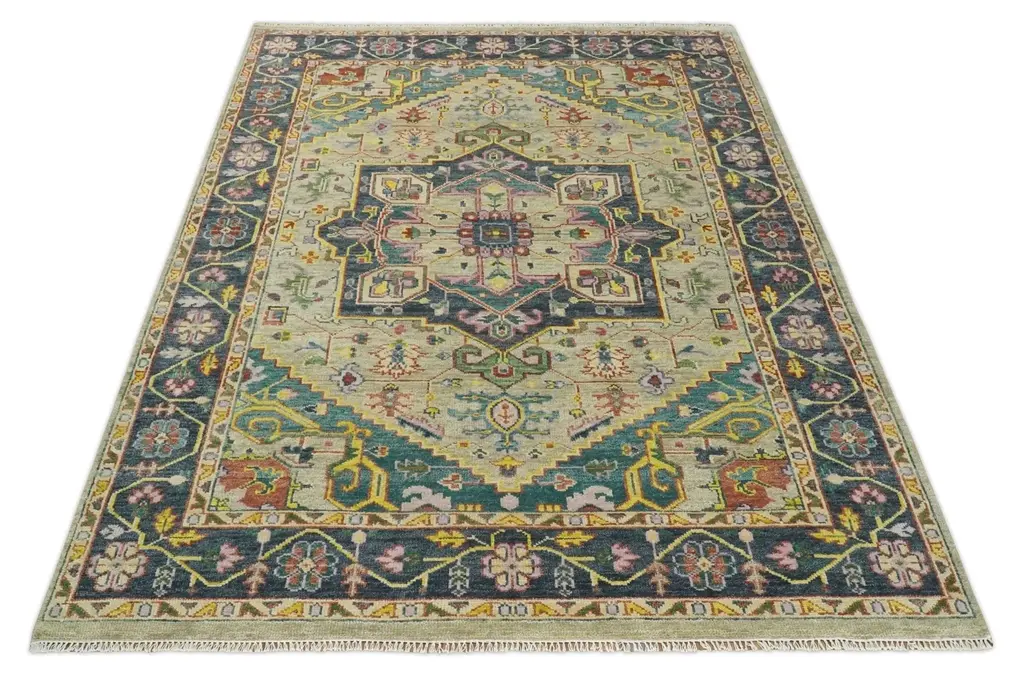 This Hand-Knotted Rug has been Made with Handspun Wool. The beautiful colors of the rug carry a legacy of the famous Heriz rug, the traditional design of the rug completes your space without making it look busy. Hand-Knotted rugs are durable and can last for decades if treated right. Hand-Knotted Rug ALL SIZES ARE MADE TO ORDER IN 30-45 DAYS Made with Wool Color: Camel, Teal and Charcoal Made with 22 knots per square inch This specific rug is made in India, in the city of Bhadohi. Bhadohi is one of the biggest rug manufacturing cities. Carpet weaving in the region dates back to the 16th century during the reign of Akbar. The skilled artisans of Bhadohi have been carrying the tradition of rug-making for centuries. USERS GUIDE Avoid prolonged moisture Vacuum regularly and/or shake to remove dust Do not pull any loose threads. Use scissors to simply cut the ends Blot spills immediately with a white cloth. Harsh chemicals may damage or fade the rug Use rug protectors under heavy furniture