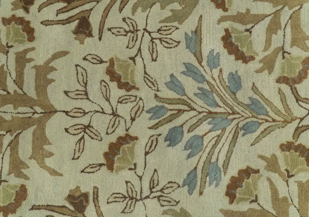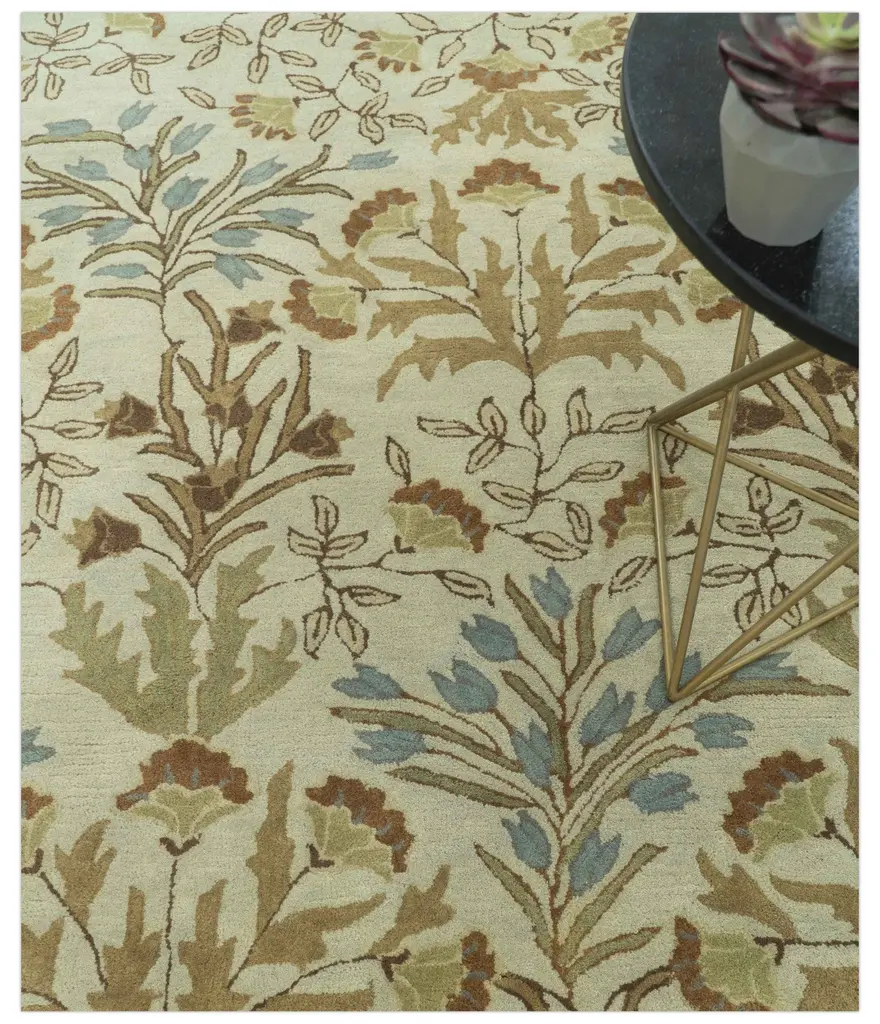 This custom-made beige and brown hand-tufted wool area rug features a traditional floral design that adds texture and warmth to any room. Made with high-quality wool, this rug is durable and easy to maintain. Elevate the look of your home with this stunning and timeless piece. Hand-Tufted Made with wool Made to Order in 25-30 Days Color: Beige, Brown, And Blue USERS GUIDE Avoid prolonged moisture Vacuum regularly and/or shake to remove dust Do not pull any loose threads. Use scissors to simply cut the ends The blot spills immediately with a white cloth. Harsh chemicals may damage or fade the rug Use rug protectors under heavy furniture