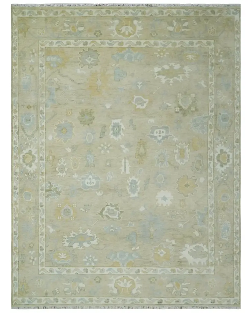 This Hand-Knotted Rug has been Made with Handspun Wool, which has a natural shine and softness to it. The beautiful colors of the rug carry a legacy of the famous rug, the traditional design of the rug completes your space without making it look busy. The rugs are durable and can last for decades if treated right. Hand-Knotted Rug Made with Wool Color : Beige Ivory and Silver Made with 38 knots per square inch ALL SIZES ARE MADE TO ORDER 30-60 Days These rugs have been made for centuries and carry a tradition and art. This specific rug is made in India, in the city of Bhadohi. Bhadohi is one of the biggest rug manufacturing cities. Carpet weaving in the region dates back to the 16th century during the reign of Akbar. The skilled artisans of Bhadohi have been carrying the tradition of rug-making for centuries. USERS GUIDE Avoid prolonged moisture Vacuum regularly and/or shake to remove dust Do not pull any loose threads. Use scissors to simply cut the ends Blot spills immediately with a white cloth. Harsh chemicals may damage or fade the rug Use rug protectors under heavy furniture