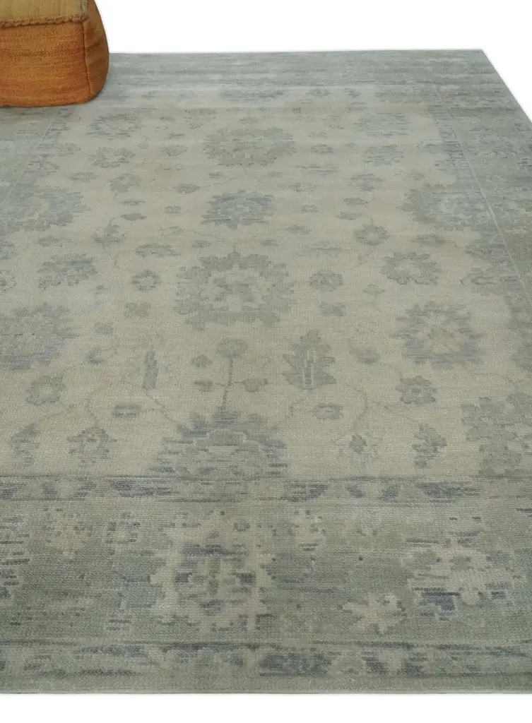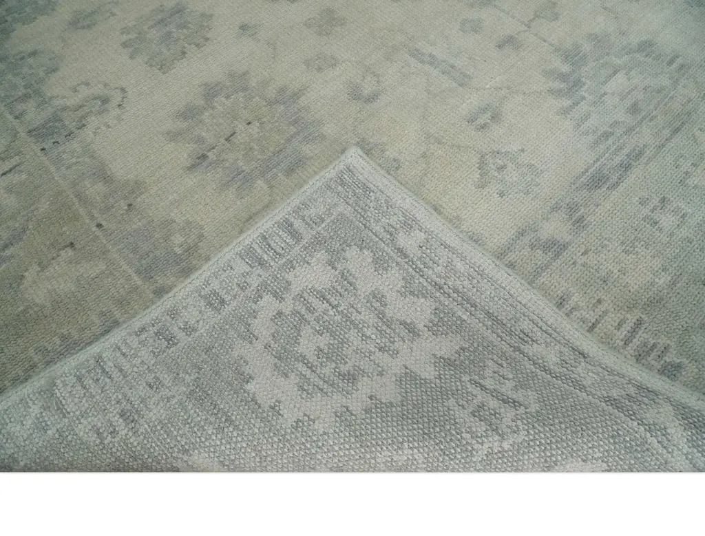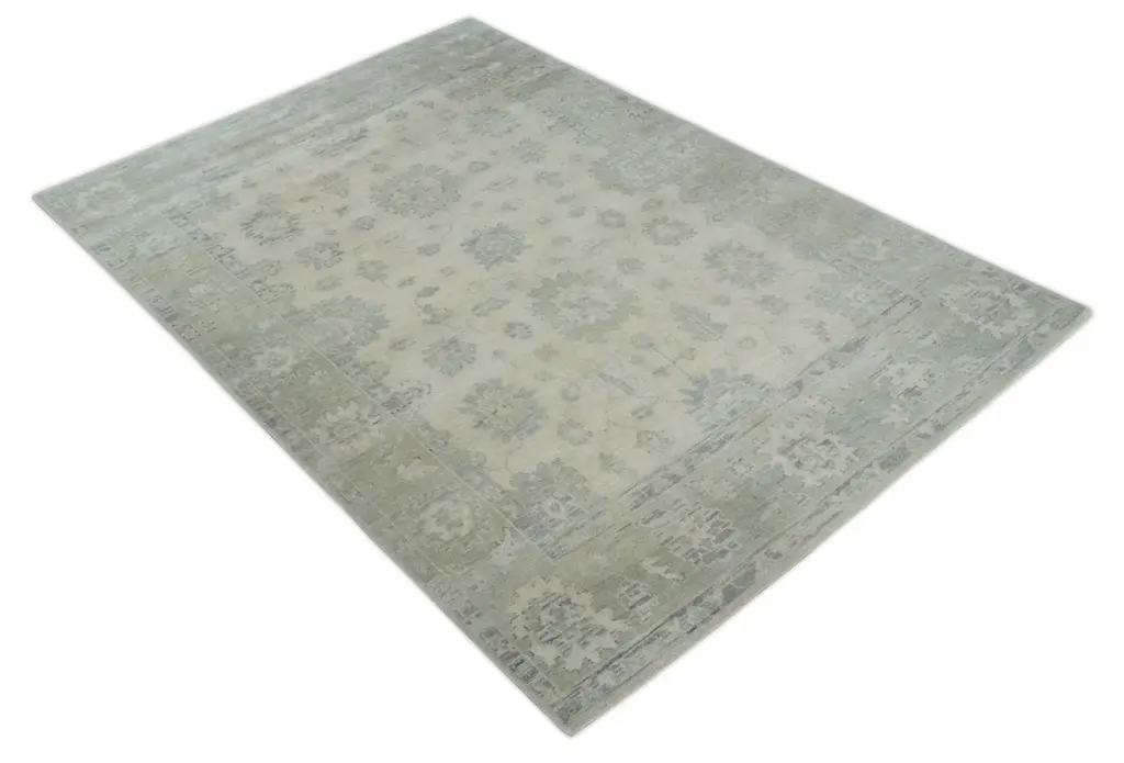 This hand-knotted traditional Oushak area rug features pattern in beige and light green wool. With its meticulous craftsmanship, this rug is perfect for any home looking to add a touch of traditional style with a modern twist. ALL SIZES ARE MADE TO ORDER IN 30-60 Days Hand-Knotted Made with Wool Color: Beige and Light Green Made with 22 knots per square inch This specific rug is made in India, in the city of Bhadohi. Bhadohi is one of the biggest rug manufacturing cities. Carpet weaving in the region dates back to the 16th century during the reign of Akbar. The skilled artisans of Bhadohi have been carrying the tradition of rug-making for centuries. USERS GUIDE Avoid prolonged moisture Vacuum regularly and/or shake to remove dust Do not pull any loose threads. Use scissors to simply cut the ends Blot spills immediately with a white cloth. Harsh chemicals may damage or fade the rug Use rug protectors under heavy furniture