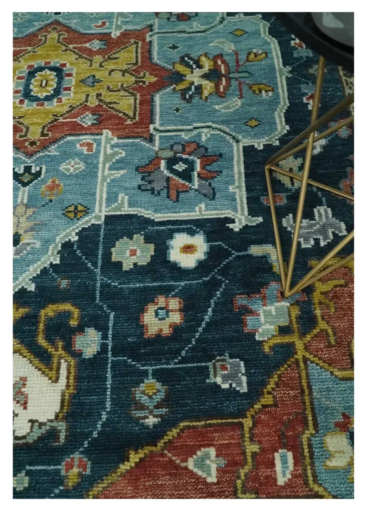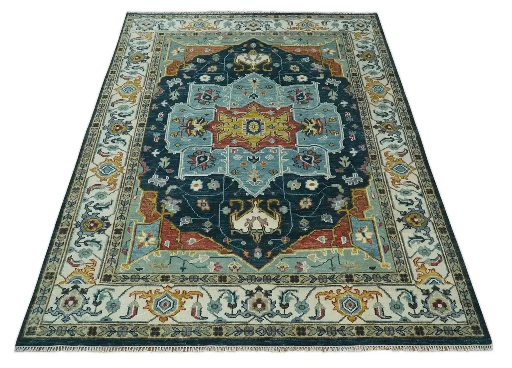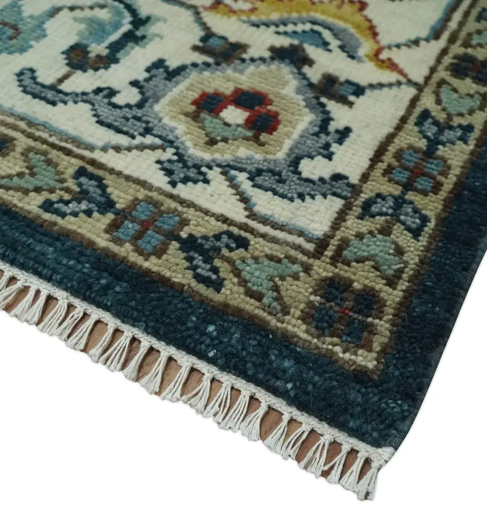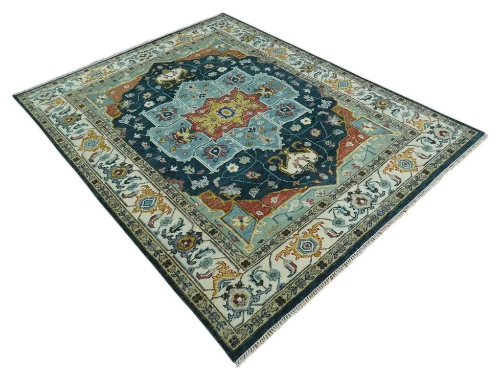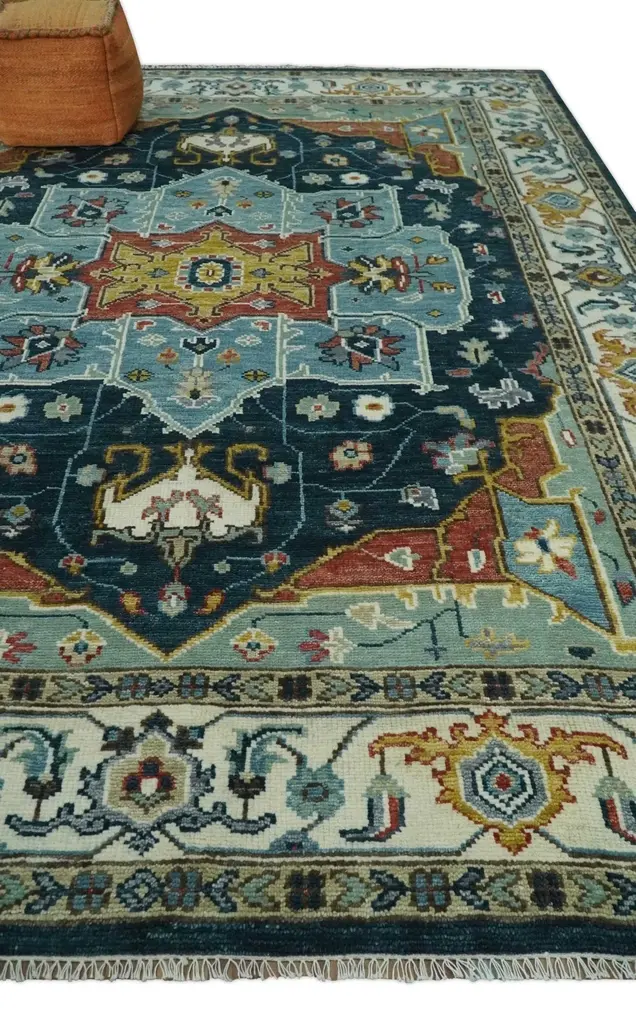 This Hand-Knotted Rug has been Made with Handspun Wool. The beautiful colors of the rug carry a legacy of the famous Heriz rug, the traditional design of the rug completes your space without making it look busy. Hand-knotted rugs are durable and can last for decades if treated right. Hand-Knotted Rug ALL SIZES ARE MADE TO ORDER IN 30-60 DAYS Made with Wool Color: Blue, Ivory, and Green Made with 22 knots per square inch This specific rug is made in India, in the city of Bhadohi. Bhadohi is one of the biggest rug manufacturing cities. Carpet weaving in the region dates back to the 16th century during the reign of Akbar. The skilled artisans of Bhadohi have been carrying the tradition of rug-making for centuries. USERS GUIDE Avoid prolonged moisture Vacuum regularly and/or shake to remove dust Do not pull any loose threads. Use scissors to simply cut the ends Blot spills immediately with a white cloth. Harsh chemicals may damage or fade the rug Use rug protectors under heavy furniture