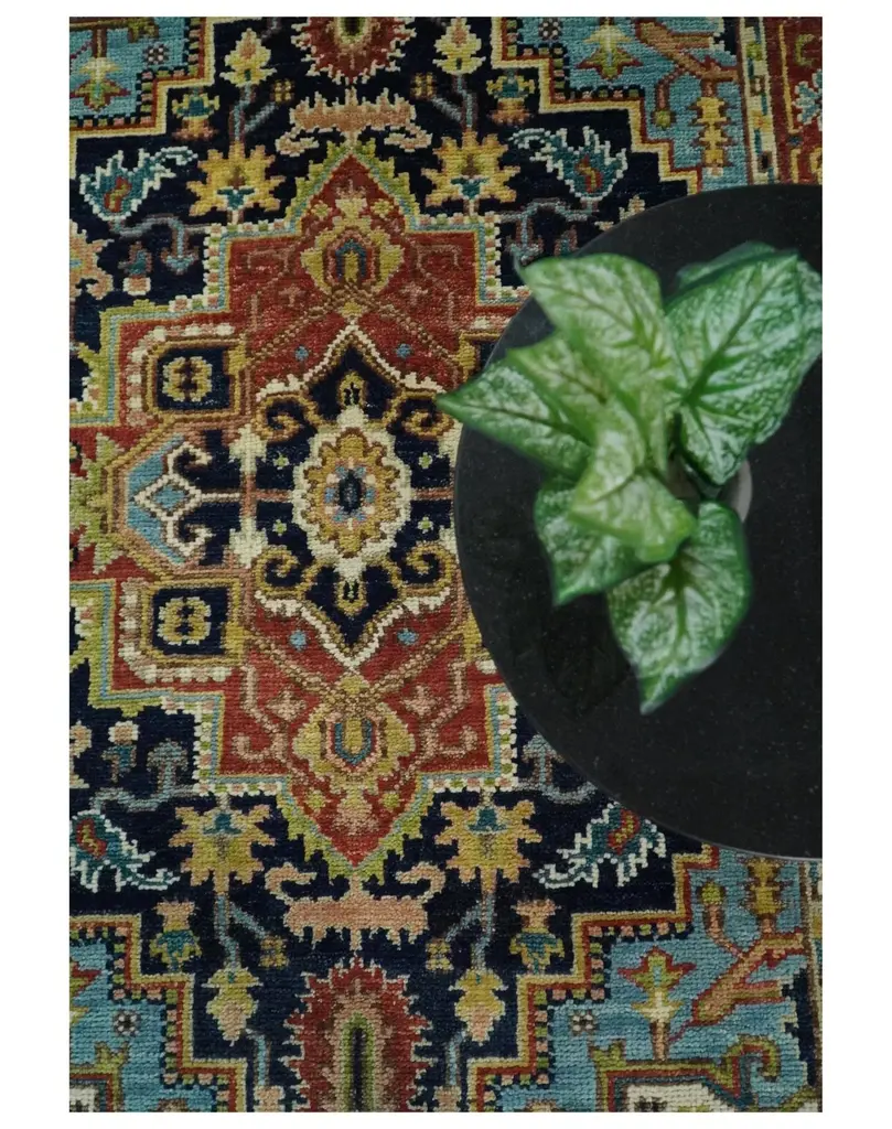 This Hand-Knotted Rug has been Made with Handspun Wool. The beautiful colors and design of the rug carry a legacy of heirloom rugs. The large design of the rug completes your space without making it look busy. The rug is durable and can last for decades if treated right. Hand-Knotted Rug Made with Soft Wool Color: Blue and Red Made to order in 30-45 Days Made with 22 knots per square inch This specific rug is made in India, in the city of Bhadohi. Bhadohi is one of the biggest rug manufacturing cities. Carpet weaving in the region dates back to the 16th century during the reign of Akbar. The skilled artisans of Bhadohi have been carrying the tradition of rug-making for centuries. USERS GUIDE Avoid prolonged moisture Vacuum regularly and/or shake to remove dust Do not pull any loose threads. Use scissors to simply cut the ends Blot spills immediately with a white cloth. Harsh chemicals may damage or fade the rug Use rug protectors under heavy furniture