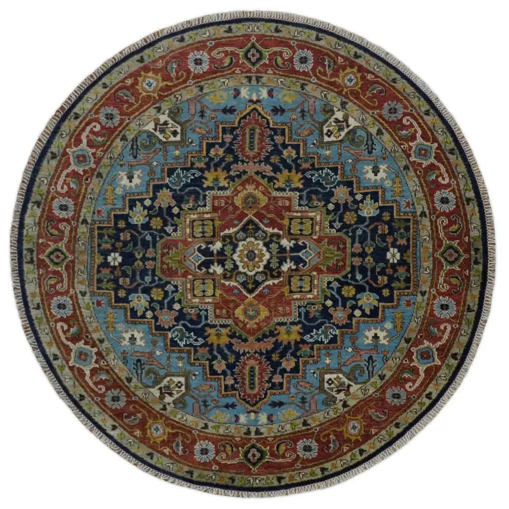 This Hand-Knotted Rug has been Made with Handspun Wool. The beautiful colors and design of the rug carry a legacy of heirloom rugs. The large design of the rug completes your space without making it look busy. The rug is durable and can last for decades if treated right. Hand-Knotted Rug Made with Soft Wool Color: Blue and Red Made to order in 30-45 Days Made with 22 knots per square inch This specific rug is made in India, in the city of Bhadohi. Bhadohi is one of the biggest rug manufacturing cities. Carpet weaving in the region dates back to the 16th century during the reign of Akbar. The skilled artisans of Bhadohi have been carrying the tradition of rug-making for centuries. USERS GUIDE Avoid prolonged moisture Vacuum regularly and/or shake to remove dust Do not pull any loose threads. Use scissors to simply cut the ends Blot spills immediately with a white cloth. Harsh chemicals may damage or fade the rug Use rug protectors under heavy furniture