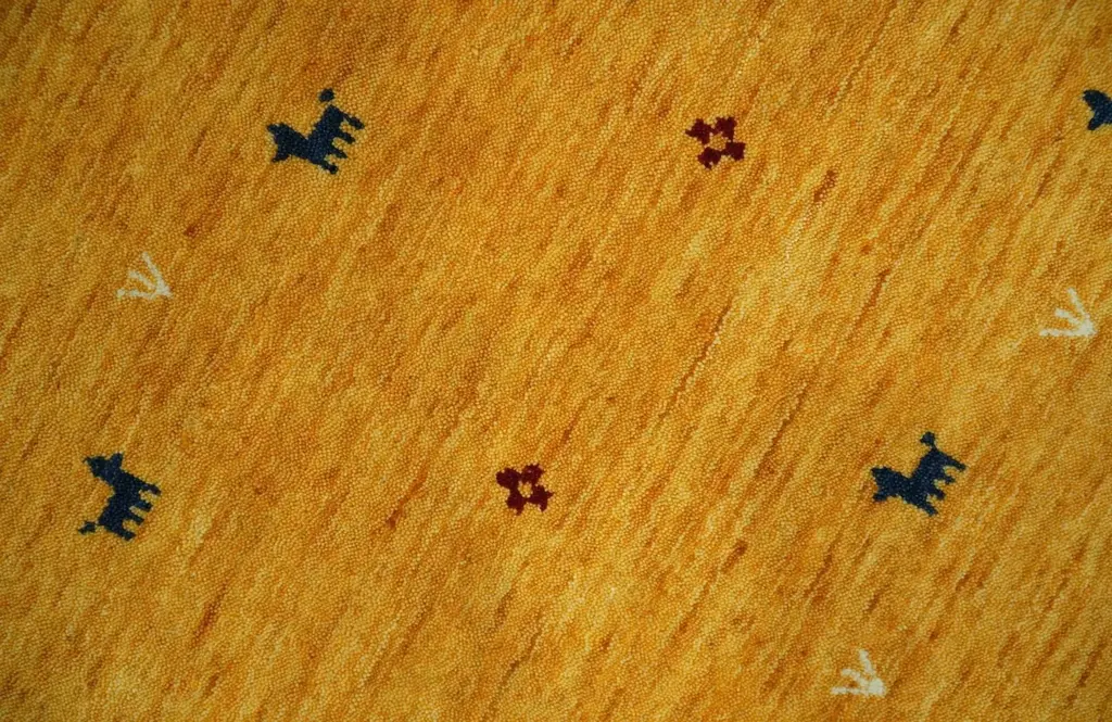 This unique Custom Made Gold Tribal Gabbeh wool Area Rug brings a touch of luxury to any room. Expertly crafted with soft, durable wool, this custom rug features a gorgeous gold design influenced by traditional tribal Gabbeh designs. Add warmth and style to your space with this one-of-a-kind statement piece. Hand-loom Rug Made with Wool Color: Gold ALL SIZES ARE MADE TO ORDER 30 - 60 Days USERS GUIDE Avoid prolonged moisture Vacuum regularly and shake to remove dust Do not pull any loose threads. Use scissors to simply cut the ends The blot spills immediately with a white cloth. Harsh chemicals may damage or fade the rug Use rug protectors under heavy furniture