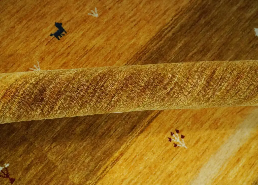 This unique Custom Made Gold Tribal Gabbeh wool Area Rug brings a touch of luxury to any room. Expertly crafted with soft, durable wool, this custom rug features a gorgeous gold design influenced by traditional tribal Gabbeh designs. Add warmth and style to your space with this one-of-a-kind statement piece. Hand-loom Rug Made with Wool Color: Gold ALL SIZES ARE MADE TO ORDER 30 - 60 Days USERS GUIDE Avoid prolonged moisture Vacuum regularly and shake to remove dust Do not pull any loose threads. Use scissors to simply cut the ends The blot spills immediately with a white cloth. Harsh chemicals may damage or fade the rug Use rug protectors under heavy furniture