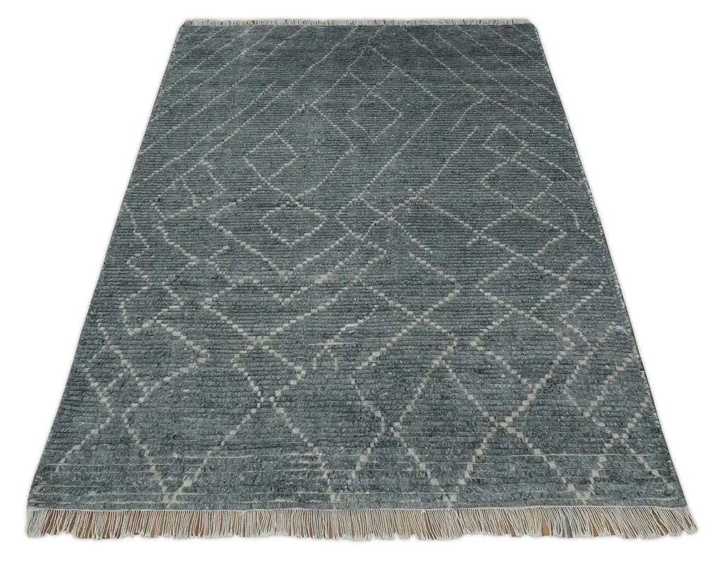 This Hand-Knotted Rug has been Made with Handspun Wool. The beautiful colors of the rug carry a legacy of the famous Morrocan rug, the traditional design of the rug completes your space without making it look busy. Hand Knotted rugs are durable and can last for decades if treated right. Hand-Knotted SIZES ARE MADE TO ORDER IN 30-45 DAYS Made with Wool Color: Charcoal and Ivory This specific rug is made in India, in the city of Bhadohi. Bhadohi is one of the biggest rug manufacturing cities. Carpet weaving in the region dates back to the 16th century during the reign of Akbar. The skilled artisans of Bhadohi have been carrying the tradition of rug-making for centuries. USERS GUIDE Avoid prolonged moisture Vacuum regularly and/or shake to remove dust Do not pull any loose threads. Use scissors to simply cut the ends The blot spills immediately with a white cloth. Harsh chemicals may damage or fade the rug Use rug protectors under heavy furniture