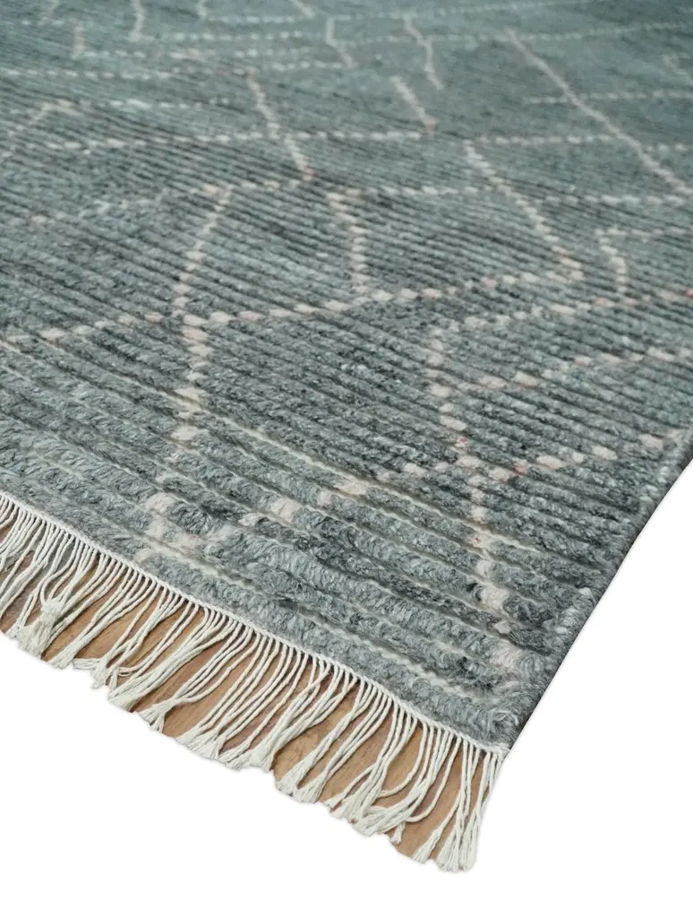 This Hand-Knotted Rug has been Made with Handspun Wool. The beautiful colors of the rug carry a legacy of the famous Morrocan rug, the traditional design of the rug completes your space without making it look busy. Hand Knotted rugs are durable and can last for decades if treated right. Hand-Knotted SIZES ARE MADE TO ORDER IN 30-45 DAYS Made with Wool Color: Charcoal and Ivory This specific rug is made in India, in the city of Bhadohi. Bhadohi is one of the biggest rug manufacturing cities. Carpet weaving in the region dates back to the 16th century during the reign of Akbar. The skilled artisans of Bhadohi have been carrying the tradition of rug-making for centuries. USERS GUIDE Avoid prolonged moisture Vacuum regularly and/or shake to remove dust Do not pull any loose threads. Use scissors to simply cut the ends The blot spills immediately with a white cloth. Harsh chemicals may damage or fade the rug Use rug protectors under heavy furniture