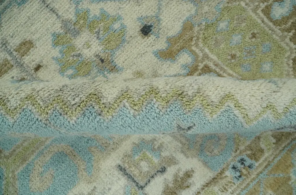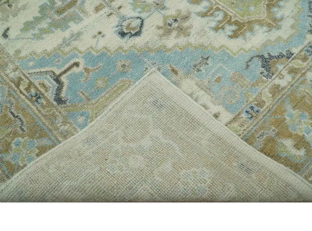 Crafted by hand using traditional techniques, this Custom Made Hand Knotted Area Rug showcases a beautiful color palette of ivory, olive, and light blue. Made from high-quality wool, this rug brings a touch of luxury and tradition to any room. Elevate your space with this timeless Heriz design. Hand-Knotted Made with Wool Made to Order in 30-45 Days Color : Ivory, Olive and Light Blue This specific rug is made in India, in the city of Bhadohi. Bhadohi is one of the biggest rug manufacturing cities. Carpet weaving in the region dates back to the 16th century during the reign of Akbar. The skilled artisans of Bhadohi have been carrying the tradition of rug-making for centuries. USERS GUIDE Avoid prolonged moisture Vacuum regularly and/or shake to remove dust Do not pull any loose threads. Use scissors to simply cut the ends Blot spills immediately with a white cloth. Harsh chemicals may damage or fade the rug Use rug protectors under heavy furniture