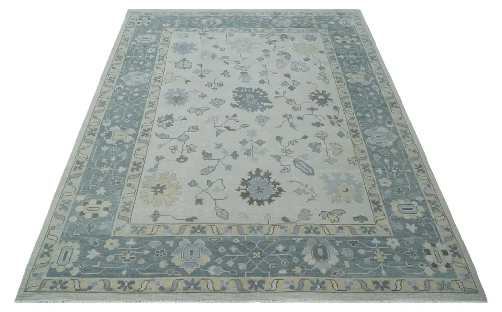 This 100% wool Rug is a beautiful addition to any home. It features a classic traditional floral design in a stunning combination of silver, blue, and beige colors. Professionally hand knotted for maximum longevity and beauty, this Oushak Rug is perfect for any room. Hand-Knotted SIZES ARE MADE TO ORDER IN 30-60 DAYS Made with Wool Color : Silver, Blue and Beige Made with 28 knots per square inch This specific rug is made in India, in the city of Bhadohi. Bhadohi is one of the biggest rug manufacturing cities. Carpet weaving in the region dates back to the 16th century during the reign of Akbar. The skilled artisans of Bhadohi have been carrying the tradition of rug-making for centuries. USERS GUIDE Avoid prolonged moisture Vacuum regularly and/or shake to remove dust Do not pull any loose threads. Use scissors to simply cut the ends The blot spills immediately with a white cloth. Harsh chemicals may damage or fade the rug Use rug protectors under heavy furniture