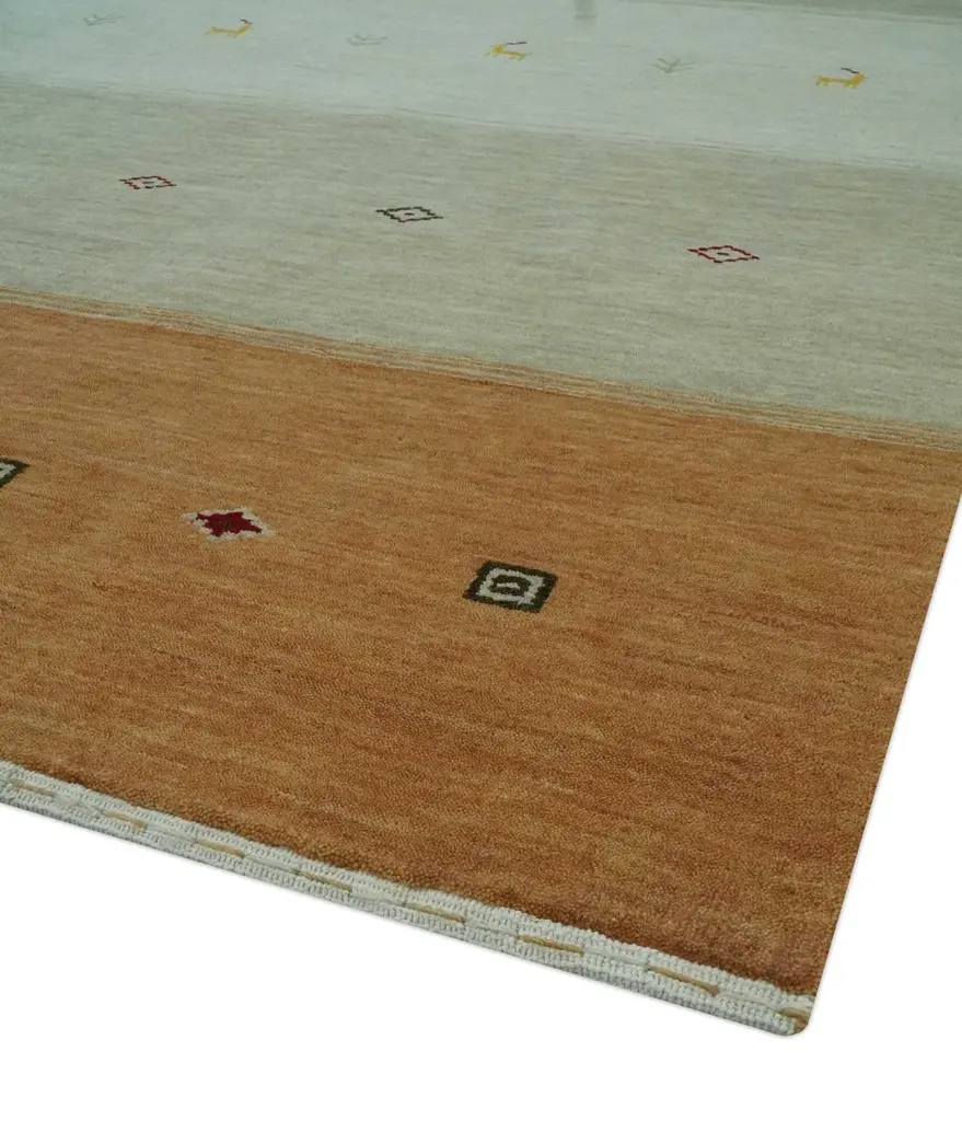 Expertly crafted with a hand loom technique, this area rug features a stunning geometrical stripes design in ivory, beige, and rust colors. Made of 100% wool, it is durable and suitable for a variety of room sizes. Add a touch of sophistication and warmth to your space with this beautiful rug. Hand-loom Rug Made with Wool Color: Ivory, Beige and Rust ALL SIZES ARE MADE TO ORDER 30 - 60 Days These rugs have been made for centuries and carry a tradition and art. This specific rug is made in India, in the city of Bhadohi. Bhadohi is one of the biggest rug manufacturing cities. Carpet weaving in the region dates back to the 16th century during the reign of Akbar. The skilled artisans of Bhadohi have been carrying the rug-making tradition for centuries. USERS GUIDE Avoid prolonged moisture Vacuum regularly and shake to remove dust Do not pull any loose threads. Use scissors to simply cut the ends The blot spills immediately with a white cloth. Harsh chemicals may damage or fade the rug Use rug protectors under heavy furniture