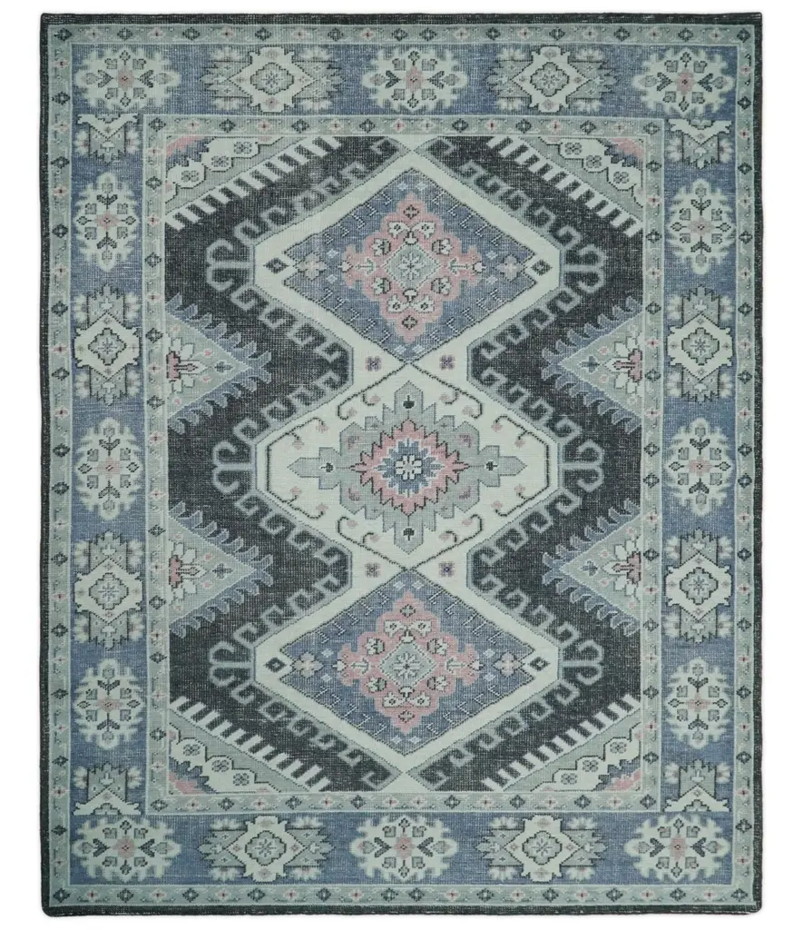 Expertly hand-knotted with a luxurious blend of wool, this traditional area rug boasts a custom design featuring swirling ivory, charcoal, silver, and blue patterns. Elevate your space with the plush comfort and timeless beauty of this one-of-a-kind masterpiece. Hand-Knotted Sizes are made to order 30-45 days Made with fine Wool Color: Ivory, Charcoal, Silver and Blue Low Pile Rug USERS GUIDE Avoid prolonged moisture. Vacuum regularly and/or shake to remove dust. Do not pull any loose threads. Use scissors to simply cut the ends. Blot spills immediately with a white cloth. Harsh chemicals may damage or fade the rug. Use rug protectors under heavy furniture.