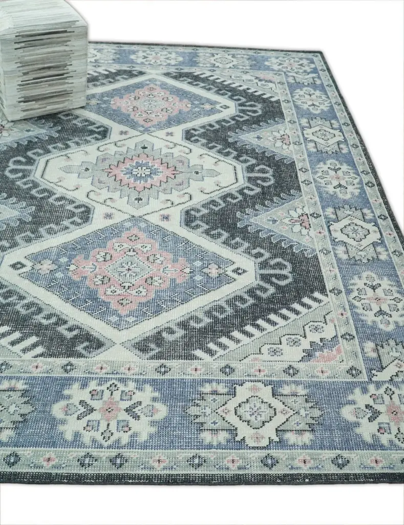 Expertly hand-knotted with a luxurious blend of wool, this traditional area rug boasts a custom design featuring swirling ivory, charcoal, silver, and blue patterns. Elevate your space with the plush comfort and timeless beauty of this one-of-a-kind masterpiece. Hand-Knotted Sizes are made to order 30-45 days Made with fine Wool Color: Ivory, Charcoal, Silver and Blue Low Pile Rug USERS GUIDE Avoid prolonged moisture. Vacuum regularly and/or shake to remove dust. Do not pull any loose threads. Use scissors to simply cut the ends. Blot spills immediately with a white cloth. Harsh chemicals may damage or fade the rug. Use rug protectors under heavy furniture.