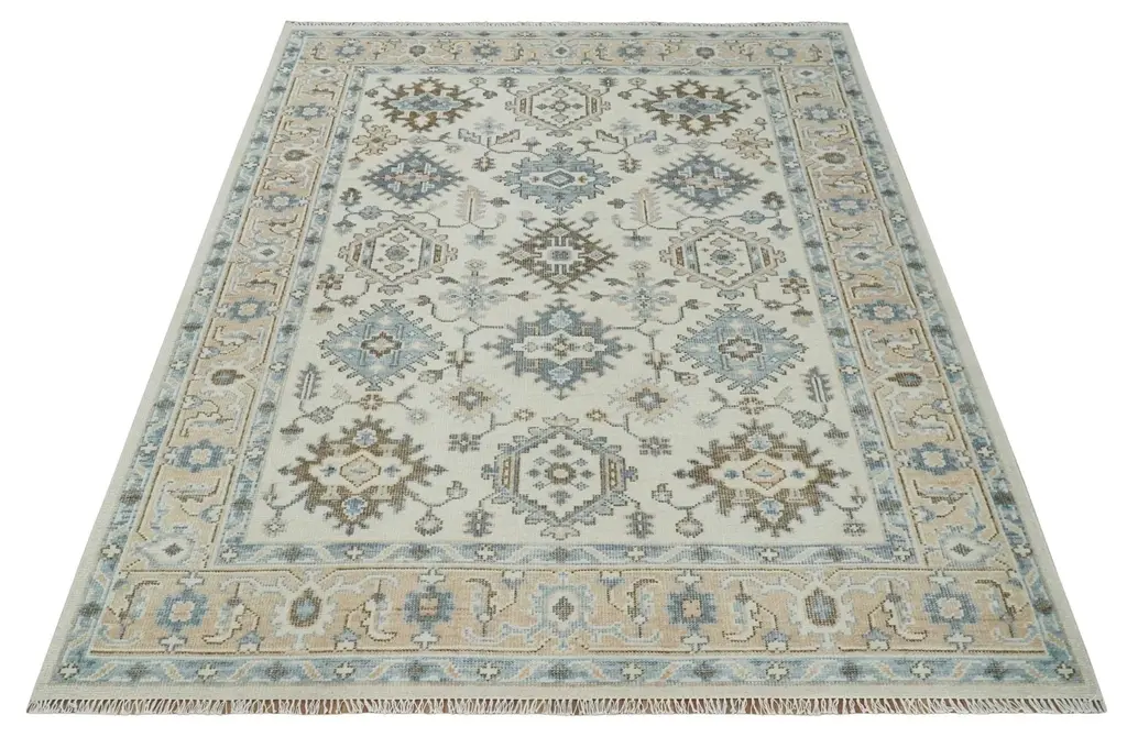 This beautiful custom-made area rug features an ikat design with peaceful ivory, peach, and gray colors - perfect for adding a warm touch to any room. It's expertly hand-knotted with Oushak wool to create a traditional look that will last. ALL SIZES ARE MADE TO ORDER IN 30-60 Days Hand-Knotted Made with Wool Color : Ivory, Peach and Gray Made with 22 knots per square inch This specific rug is made in India, in the city of Bhadohi. Bhadohi is one of the biggest rug manufacturing cities. Carpet weaving in the region dates back to the 16th century during the reign of Akbar. The skilled artisans of Bhadohi have been carrying the tradition of rug-making for centuries. USERS GUIDE Avoid prolonged moisture Vacuum regularly and/or shake to remove dust Do not pull any loose threads. Use scissors to simply cut the ends Blot spills immediately with a white cloth. Harsh chemicals may damage or fade the rug Use rug protectors under heavy furniture